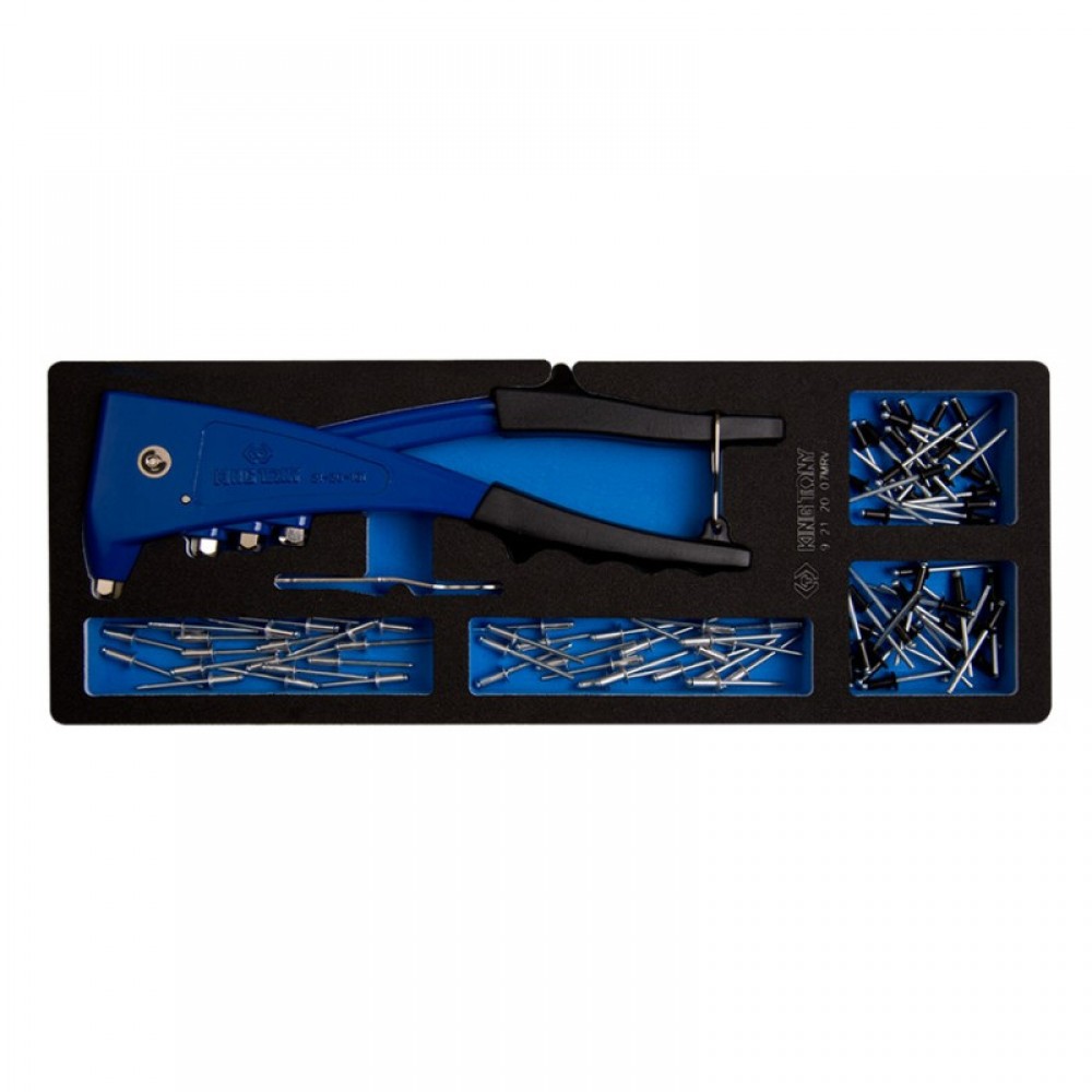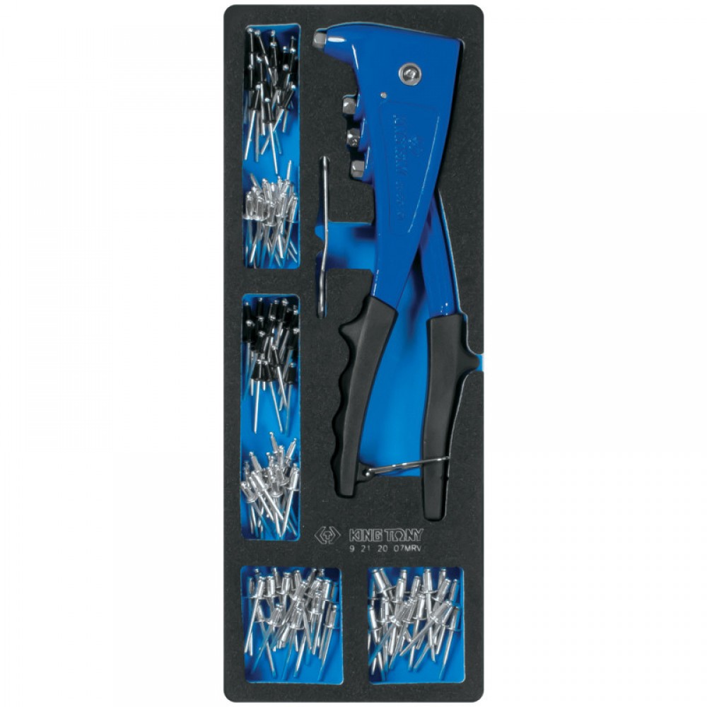 Заклепочник с набором заклепок King Tony 9-21-20-07MRV в ложементе EVA (ЭВА, полимер на основе этилена и винилацетата) из 121 предмета, предназначен для надежного скрепления материалов алюминиевыми заклепками.
