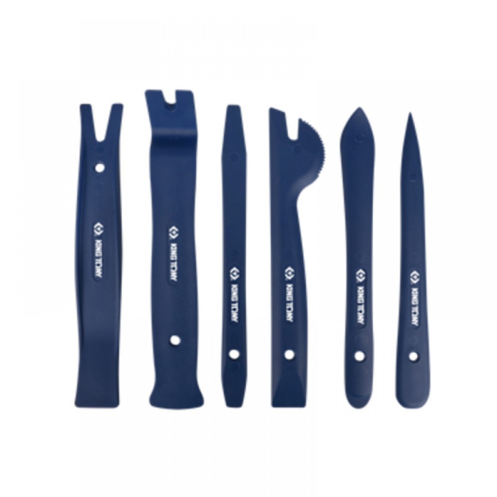 Набор съемников (лопатки) для панелей облицовки, 6 предметов KING TONY 9CI016. В набор входят лопатки различных размеров и типов. Лопатки (съёмники) предназначены для демонтажа различных клипс, фитингов, замков и прочих крепёжных пластиковых элементов. Форма съёмников позволяет применять набор при разборке облицовочных и приборных панелей автомобиля, не опасаясь их повредить.
