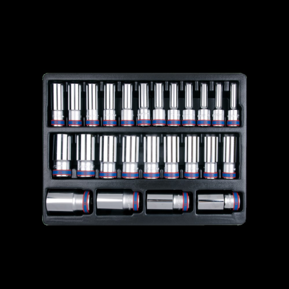 Поставляется слесарная оснастка в пластиковом кейсе. Набор предназначен для обеспечения инструментальных тележек и верстаков. Требуется размер ящика – 375х280 мм. Торцевые головки изготовлены из хромованадиевой стали. Отделка – хромирование и полировка. Головки имеют удлиненную форму – удобно работать со скрытыми элементами крепежа. 12-гранная посадка обеспечивает возможность захвата граней болта или гайки под небольшим углом.