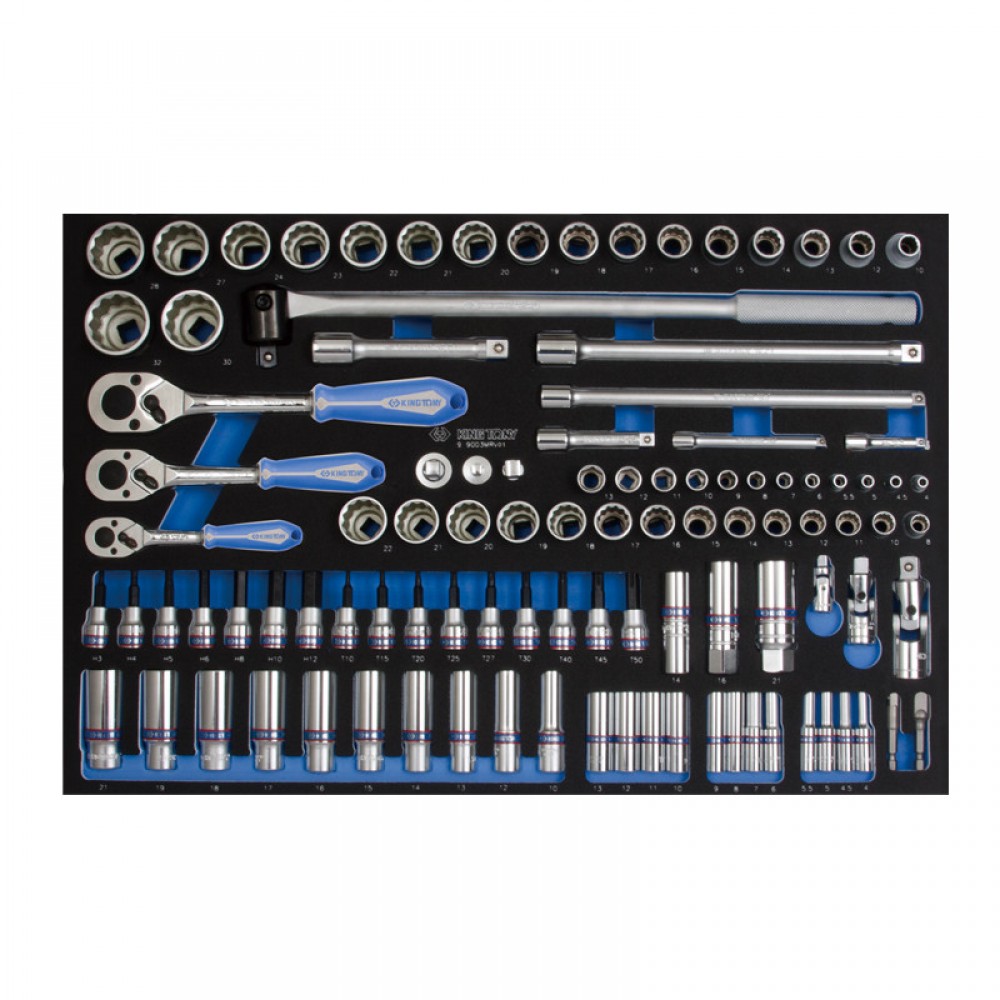 Набор торцевых головок и воротков в ложементе 1/4" 3/8" 1/2". 103 предмета. (EVA ложемент) – полный комплект профессионального ручного инструмента для работы с резьбовыми соединениями. Комплект нацелен на ремонт двигателя и ходовой части автомобиля. Набор предназначен для автосервиса и предприятий, использующих для хранения инструментов слесарные верстаки, тележки или модульные шкафы King Tony.