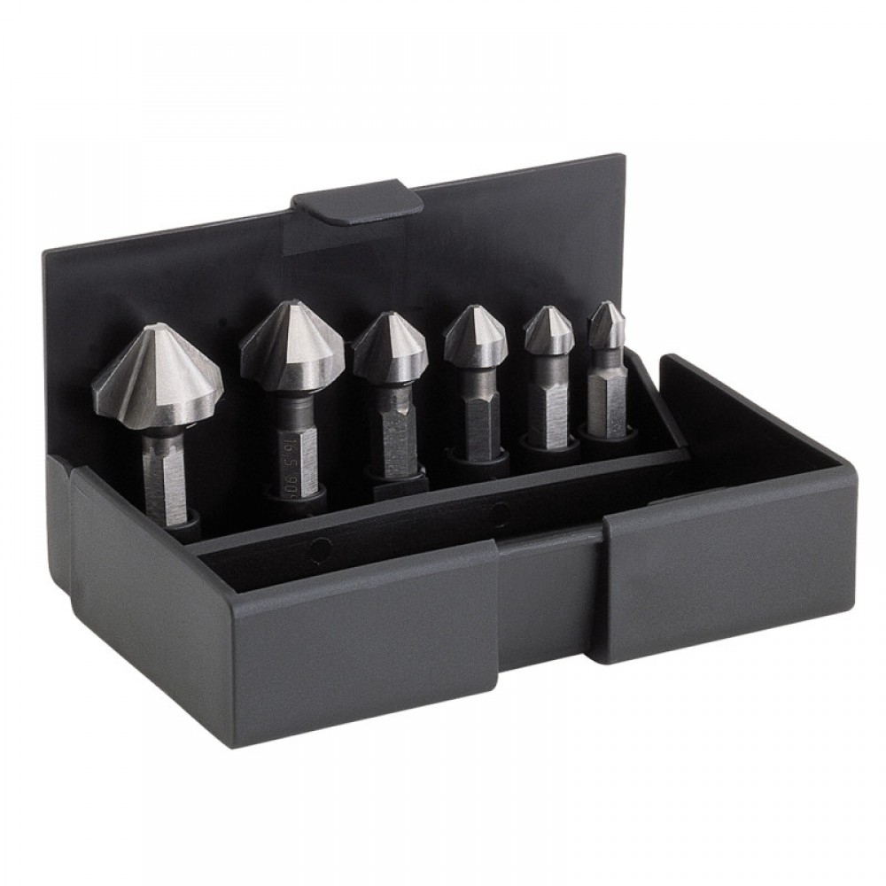 Набір зенковок-біт, 6,3-20,5 мм, 6 предметів, пластиковий кейс Набір зенковок-біт 67300 призначений для обробки просвердлених отворів під головки болтів, гвинтів та заклепок. Зенковки застосовуються в ручних, а також в ручних електро- та пневмоінструментах. Включає цілий перелік інструменту в кейсі, зручному для зберігання та транспортування. Назва Параметри Кількість Зенківки-біти 6,3 - 8,3 - 10,4 12,4 – 16,5 – 20,5 мм 6 шт. Кейс пластиковий 1шт.