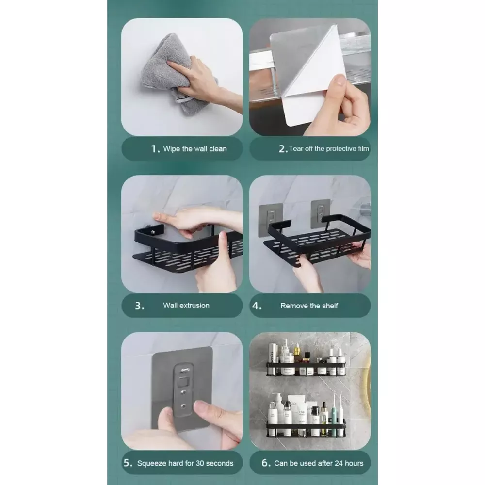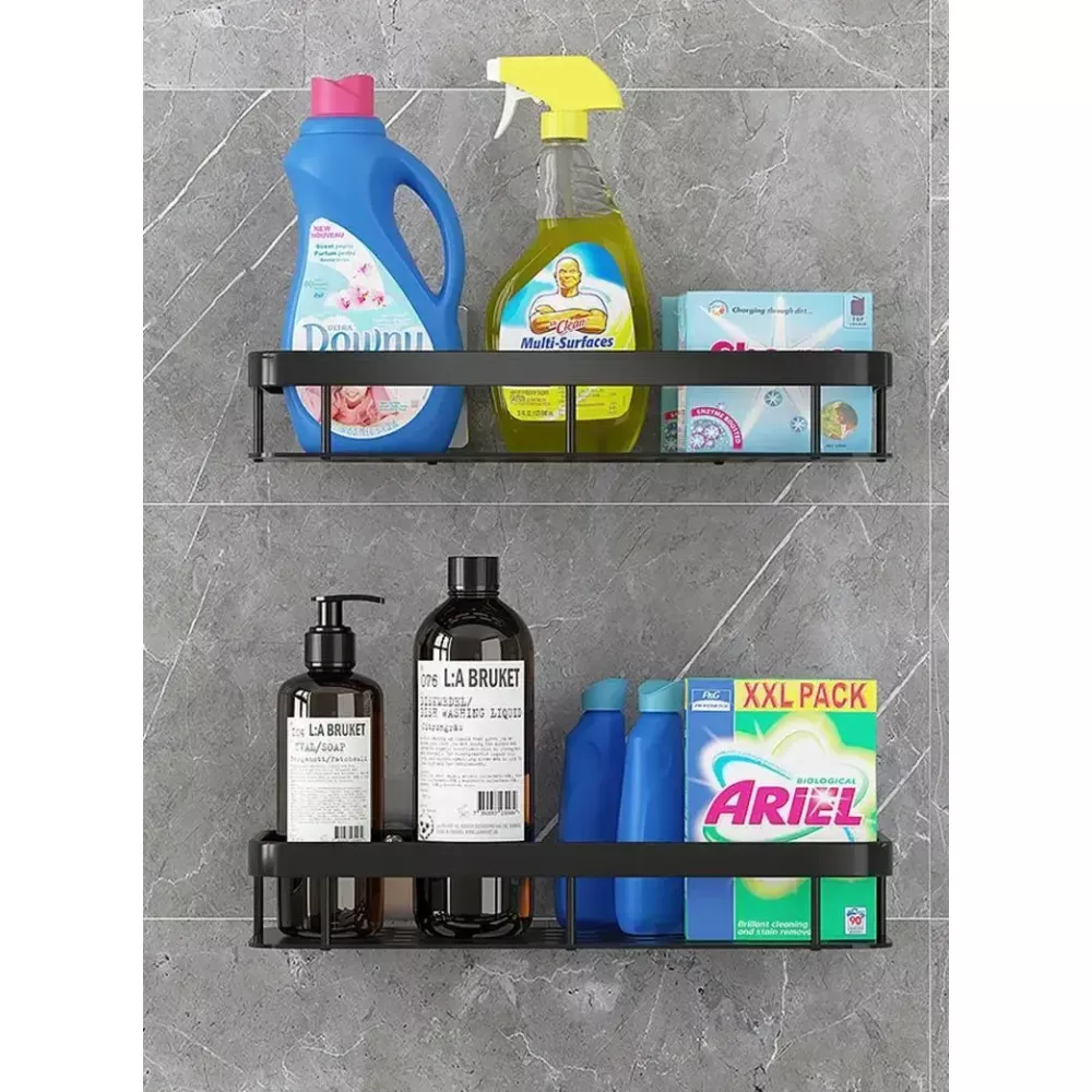 Полка стильного черного цвета гармонично впишется в интерьер, а монтаж его нарушит, не требуется применения строительного инструмента. Никаких дырок, мусора и шума от дрели! Скругленный дизайн снижает травмоопасность, а перфорированное дно не позволяет воде застаиваться, эффективно удаляя влагу и просушивая предметы гигиены.