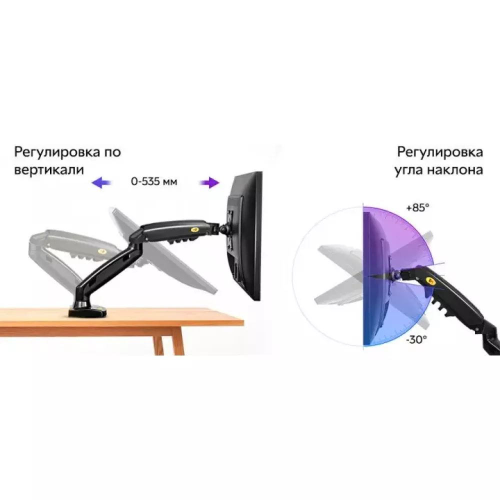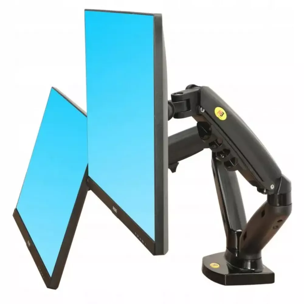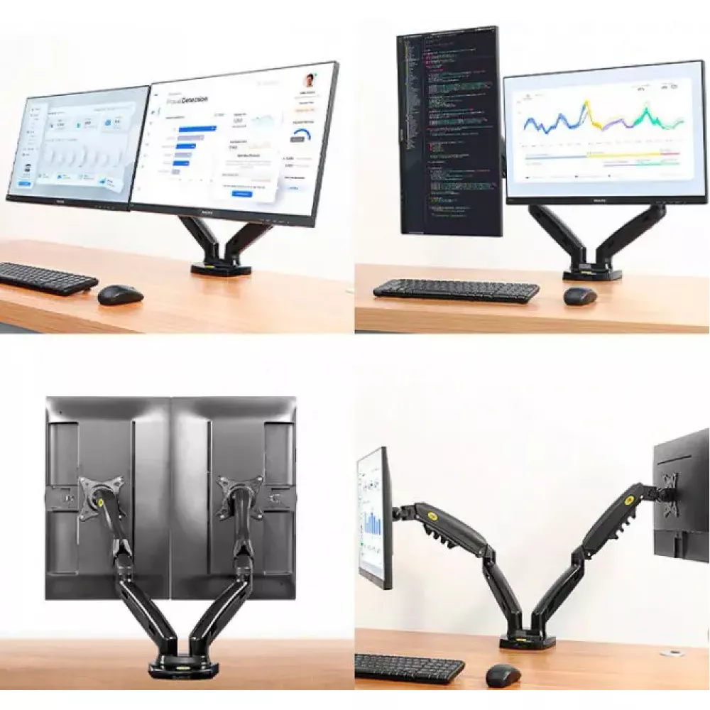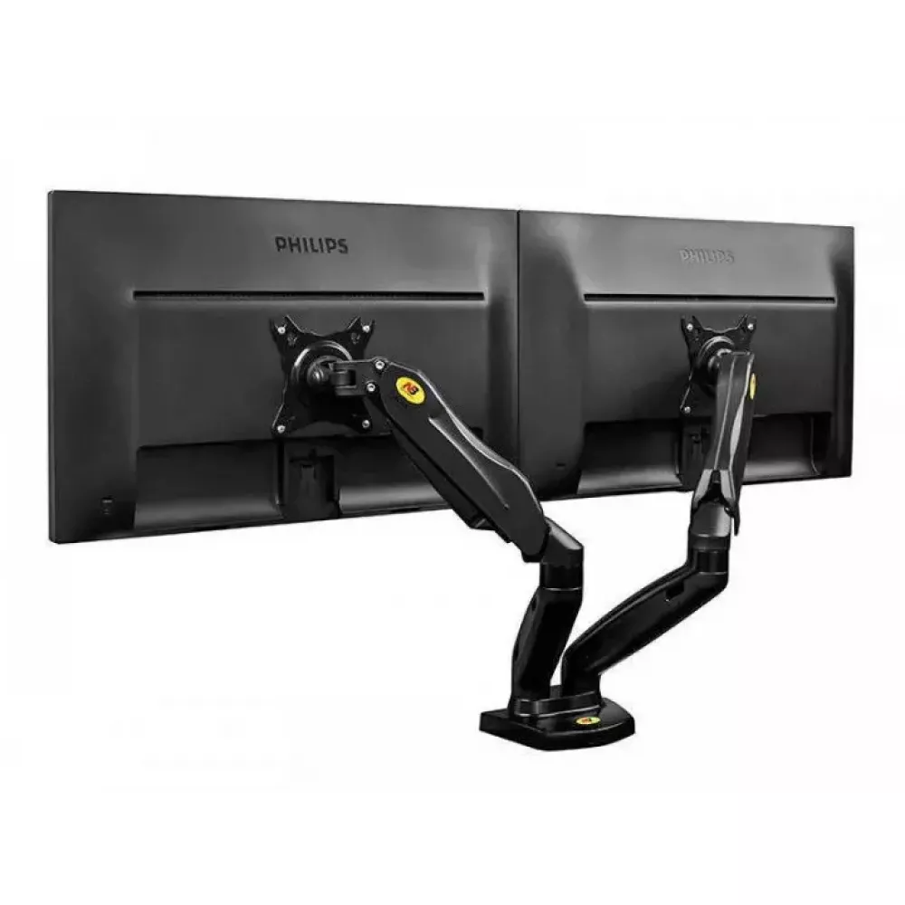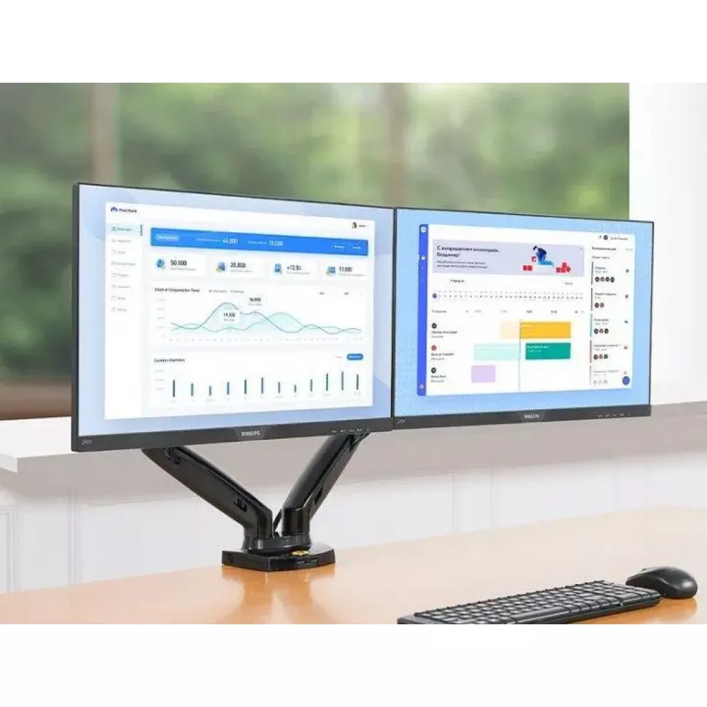 Кронштейн для двух мониторов с газлифтом даёт возможность настроить комфортный, а главное эргономичный угол просмотра и высоту экрана. Вы сможете организовать рабочее место с учётом индивидуальных особенностей, таких как освещение, высота и размер стола. Немаловажным преимуществом является то, что вы освободите дополнительное пространство на рабочей поверхности.