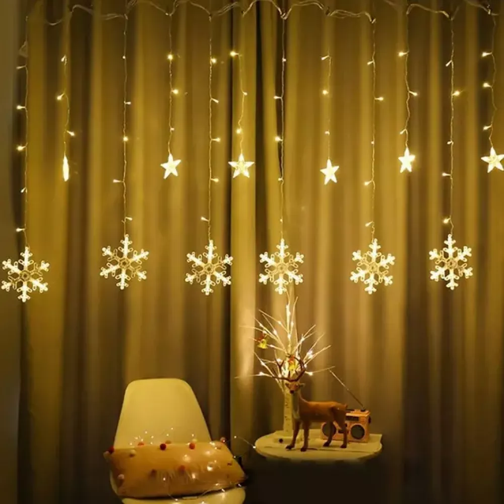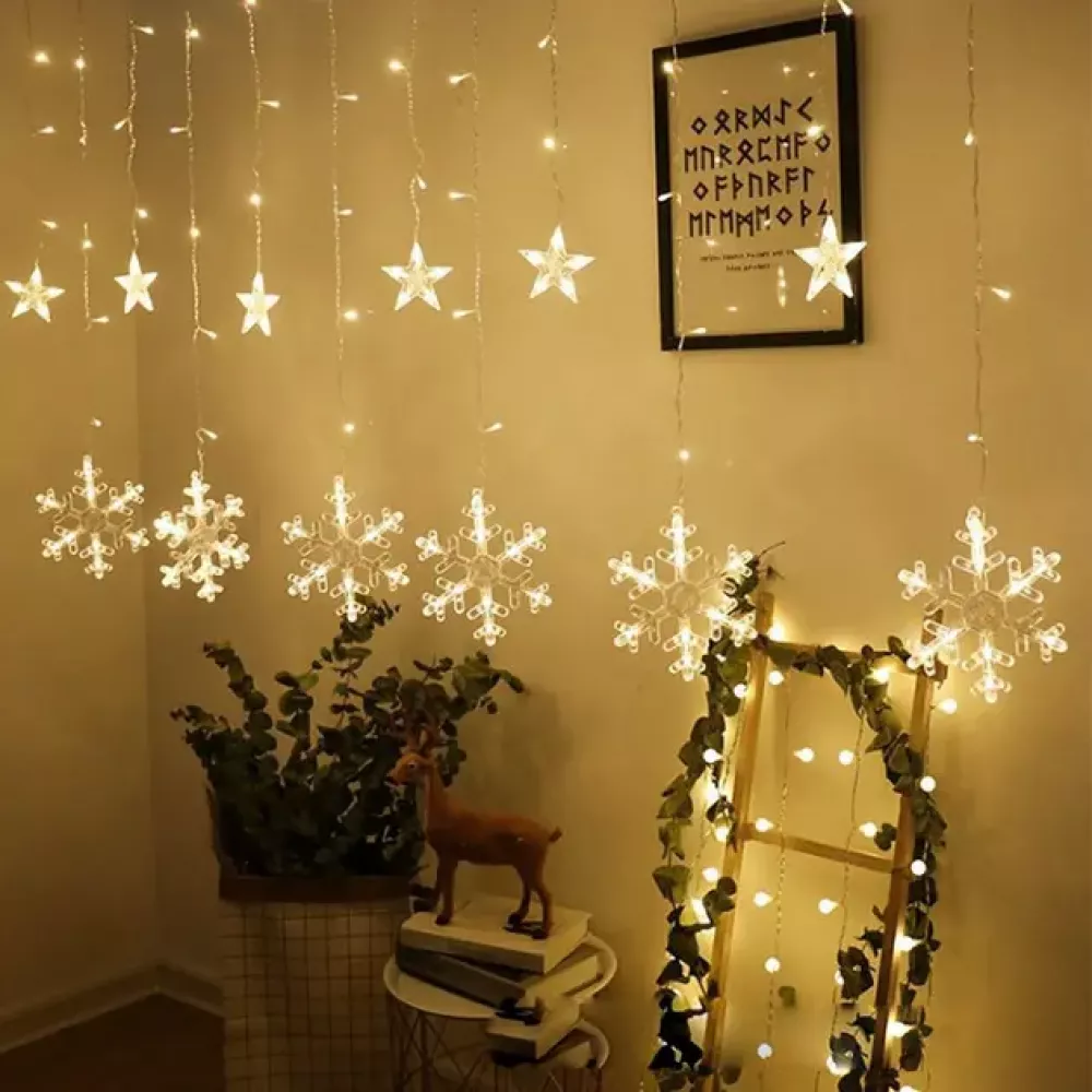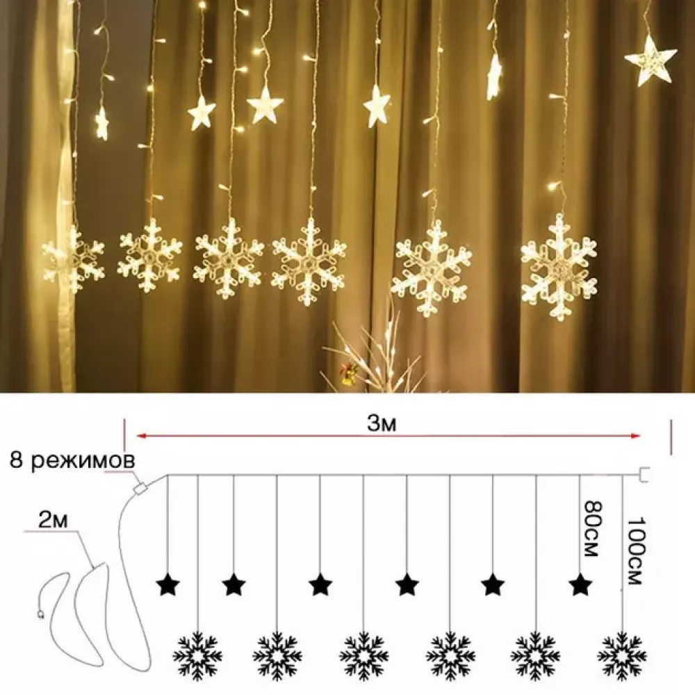 Светодиодная гирлянда-штора состоит из 2.5-метрового шлейфа-основания с вертикально свисающими 12 нитями разной длины: 6 больших снежинок и 6 звезд.