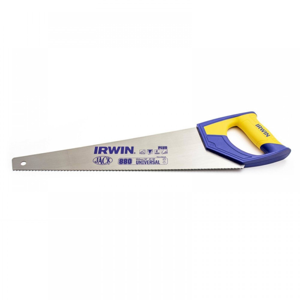 Ножівка по дереву 450мм 8T/9P універсальна Plus, IRWIN Призначена для пиляння заготовок з деревини м'яких та твердих порід, фанери, ДСП, ПХВ. Жорстке полотно товщиною 0,85 мм із високоякісної холоднокатаної сталі С75, для максимальної стабільності та передачі зусилля оператора. Зуби мають тригранну заточку, виконану за технологією TGT, це дозволяє виробляти пиляння, коли пила рухається не тільки вперед, а й назад. Оптимізоване розведення зубів для швидкого старту, чистого та прямолінійного різу Універсальний розмір і відстань зубів 8TPI/9Р дозволяє пиляти деревину як уздовж, так і поперек волокон, а також створює ефективне відведення для тирси. Лезо інструменту покрите антикорозійним лаком на водній основі, що в 4 рази надійніше і довговічніше, ніж традиційне покриття. Дуже зручна ергономічна ручка із двох матеріалів, приварена ультразвуком для надійної фіксації. Також ручка має збільшене коло рукоятки (гарантує ідеальне відчуття контролю в процесі різання) та оптимізований простір для рук, що надає більше комфорту для роботи в рукавичках. Рукоятка має грані для побудови кутів 90 і 45 для зручності при розмітці. Асортимент ножівок IRWIN ® Jack® є найкращими у своєму класі ручними пилками для сучасних професіоналів. Передова технологія зубів та ергономічна рукоятка ProTouch™ роблять ручні пилки IRWIN найкращим вибором для швидкості, простоти та якості різання.