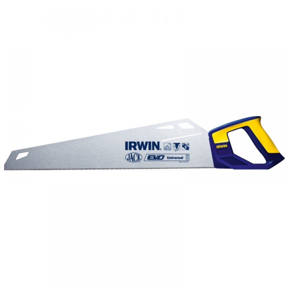 Ножівка по дереву EVO 490мм універсальна, IRWIN Призначена для пиляння заготовок з деревини м'яких та твердих порід, фанери, ДСП, ПХВ. Жорстке полотно товщиною 0,85 мм із високоякісної холоднокатаної сталі С75, для максимальної стабільності та передачі зусилля оператора. Зуби мають тригранну заточку, виконану за технологією TGT, це дозволяє виробляти пиляння, коли пила рухається не тільки вперед, а й назад. Оптимізоване розведення зубів для швидкого старту, чистого та прямолінійного різу Універсальний розмір і відстань зубів 8TPI/9Р дозволяє пиляти деревину як уздовж, так і поперек волокон, а також створює ефективне відведення для тирси. Великий кут передньої частини леза сприяє кращій стійкості полотна. Лезо інструменту покрите антикорозійним лаком на водній основі, що в 4 рази надійніше і довговічніше, ніж традиційне покриття. Унікальна рукоятка. Кут та низьке положення ручки призначені для значного підвищення продуктивності та зручності використання. Дозволяє природним чином використовувати всю довжину леза, що знижує кількість проходів і, отже, зусилля, що додаються. Дуже зручна ергономічна ручка із двох матеріалів, приварена ультразвуком для надійної фіксації. Також ручка має збільшене коло рукоятки (гарантує ідеальне відчуття контролю в процесі різання) та оптимізований простір для рук, що надає більше комфорту для роботи в рукавичках. Полотно ножівки має грані для побудови кутів 90 і 45 для зручності при розмітці. Асортимент ножівок IRWIN ® Jack® є найкращими у своєму класі ручними пилками для сучасних професіоналів. Передова технологія зубів та ергономічна рукоятка ProTouch™ роблять ручні пилки IRWIN найкращим вибором для швидкості, простоти та якості різання.