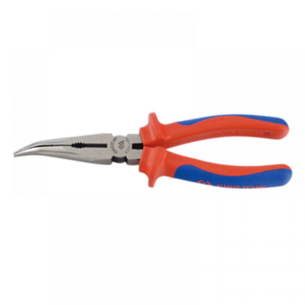 Пасатижі тонкі. ніс загнуті 200 мм (1000 V) Довгогубці діелектричні 6336-08A виготовляються тайванським брендом KING TONY . Довжина інструменту – 200 мм. Вага 250 грам. Довгогубці (качконоси) із вигнутим носиком. Призначені для роботи в мережах із напругою до 1000 вольт. Для випадків, коли цей показник вищий, необхідно використовувати інструмент іншого типу. Довгі вигнуті губи дозволяють зафіксувати предмет у віддаленому важкодоступному місці. Завдяки насічкам на внутрішній частині фіксація відбувається більш надійно. Завдяки різальним кромкам інструмент може перекусити невеликий діаметр кабель, дріт. Спеціальне вилучення на робочій частині губок дає можливість зафіксувати деталь з круглим перетином. На ручках також є виступи, що захищають руку від зіткнення з струмопровідною частиною інструменту. Самі качконоси виготовляються з легованої хромованадієвої сталі. Матеріал має високу міцність, довговічність, погано піддається корозійному впливу. Ручки виготовлені з TPR гуми. Міцний, погано схильний до стирання матеріал, що не поступається за еластичністю звичайній гумі. При цьому не втрачає своїх властивостей при перепадах температури, є чудовим діелектриком. Виготовлено відповідно до міжнародного сертифікату IEC DIN EN 60900.