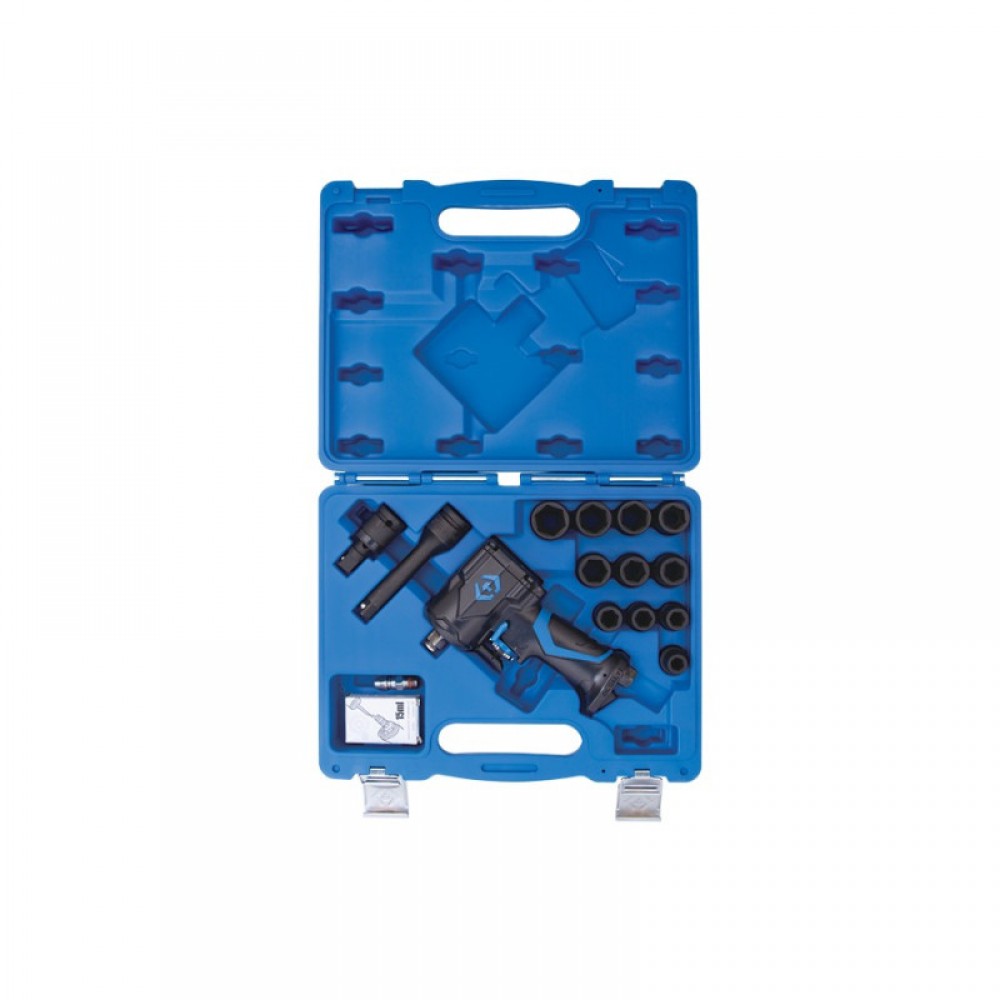Особенность инструмента в том, что поставляется он с обильным комплектом торцевых насадок. В наборе присутствуют также удлинитель вала и кардан под головки. Приятное дополнение для покупателя – тюбик смазки в комплекте и быстросъёмный штуцер для подключения инструмента к пневматической системе. Вся перечисленная оснастка заключена в удобный пластиковый кейс. Порадует покупателя и цена гайковёрта в комплекте с торцевыми головками.