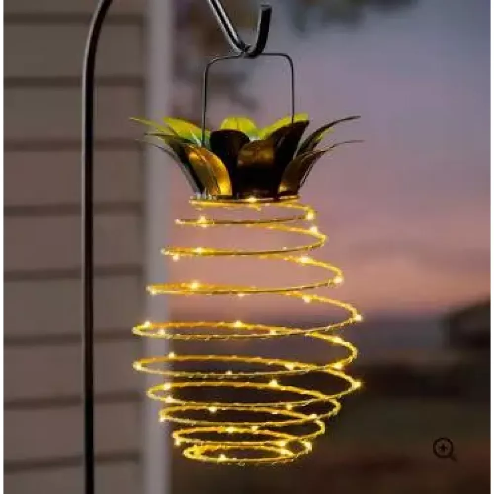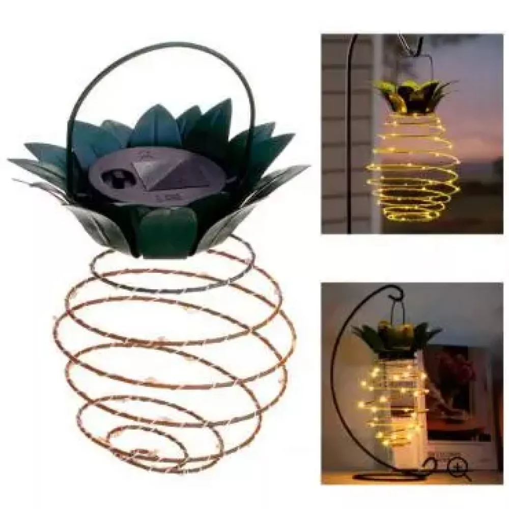 Декоративный светильник ананас сделан из пластика (листья, база с солнечной батареей) и металлической проволоки с 25 светодиодами (спираль, петля для подвешивания), компактный, при этом достаточно увесистый, чтобы не болтаться на ветру. Водонепроницаемая конструкция (IP45) позволяет использовать светильник при любой погоде. Он не боится дождя, снега и других факторов.
