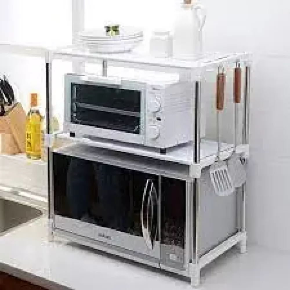 Раздвижные полки позволяют регулировать ширину стеллажа: от 50 до 85 см, поэтому конструкция подойдет даже крупногабаритной микроволновки.