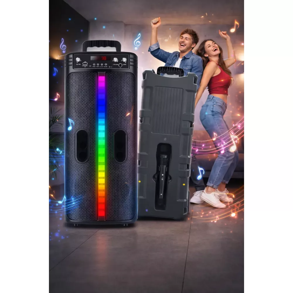 Колонка выполнена в крепком корпусе размером 218х202х595 мм, что делает ее устойчивой и удобной для переноски. Несмотря на внушительные размеры, модель остается портативной и легко умещается в багажник автомобиля. Вы можете взять ее на пикник, вечеринку или использовать дома.