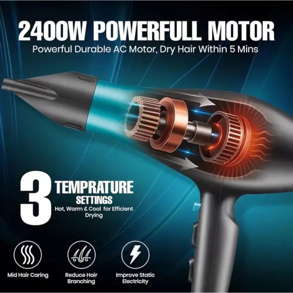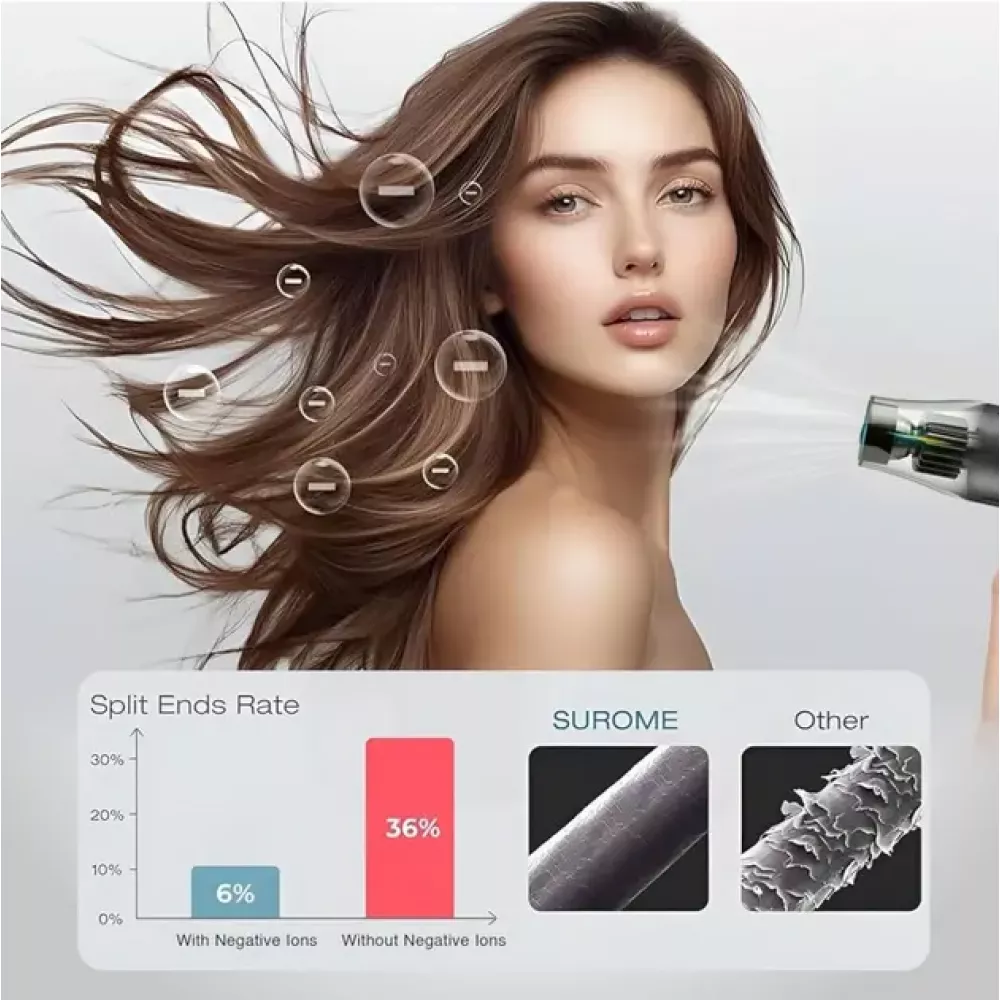 Высокая производительность: фен оборудован мощным двигателем, обеспечивающим быструю и эффективную сушку для любого типа волос.