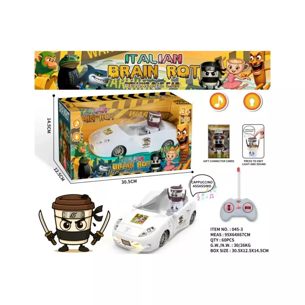 Погрузитесь в мир хаотичного и смешного Italian Brain Rot! Эта яркая радиоуправляемая машинка с забавным персонажем за рулем – идеальный подарок для детей и фанатов.