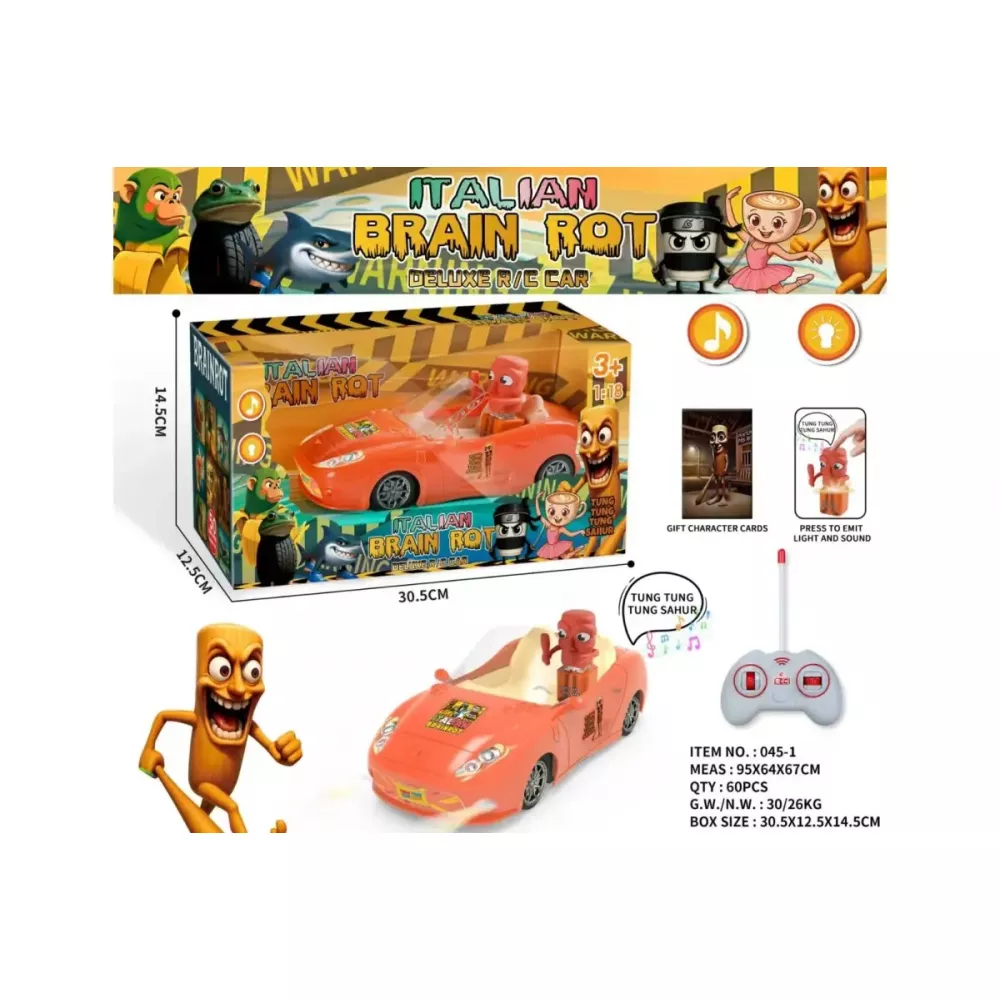 Погрузитесь в мир хаотичного и смешного Italian Brain Rot! Эта яркая радиоуправляемая машинка с забавным персонажем за рулем – идеальный подарок для детей и фанатов.