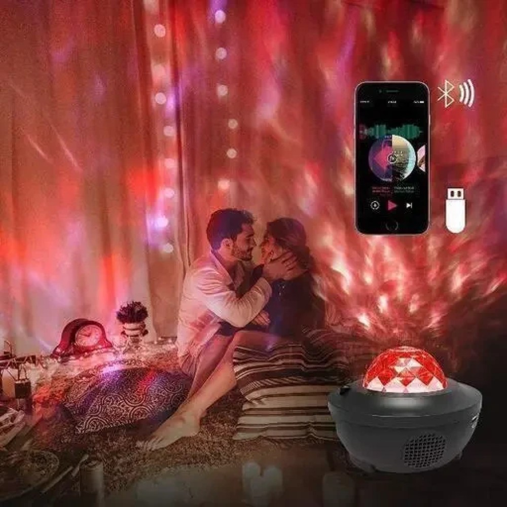 Проекция звездного неба: Лампа способна создать реалистичный эффект северного сияния, проецируя яркие и красочные изображения на потолок или стены комнаты. Это позволяет создать уютную и романтическую атмосферу.