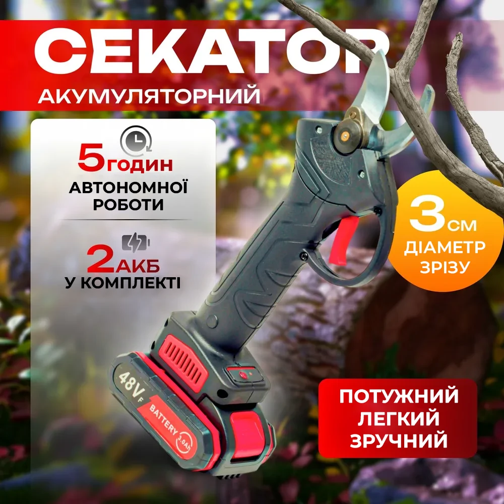 Секатор электрический 48V с двумя аккумуляторами и точильным камнем