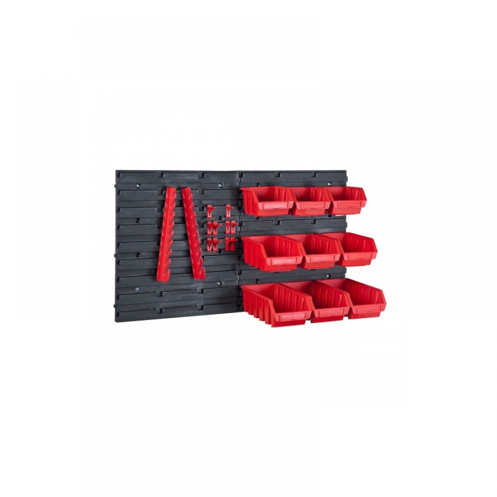 • Навесные элементы – 6 красных ящиков 116х112х75 мм, 3 бокса 116х161х75 мм, держатель для набора гаечных ключей, 8 крючков для инструментов.