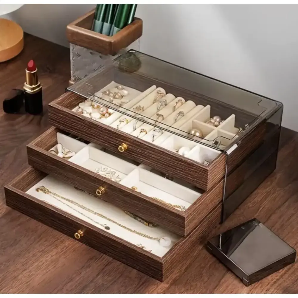 Шкатулка-органайзер для украшений с тремя выдвижными ящиками предназначена для аккуратного хранения колец, сережек, браслетов, часов и других аксессуаров. Внутренняя организация включает роллы для колец, маленькие ячейки для маленьких украшений и просторный отсек для огромных изделий. Прозрачная крышка защищает содержание от пыли и позволяет видеть все украшения без необходимости открывать органайзер.