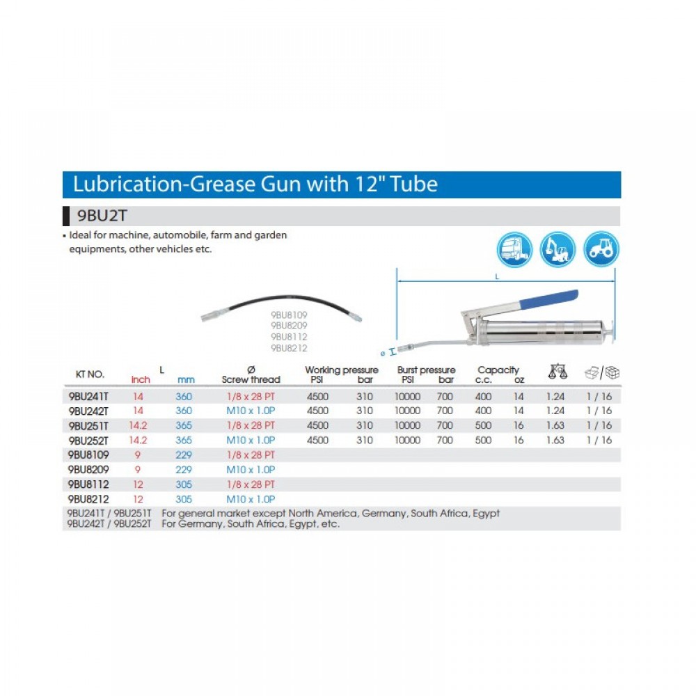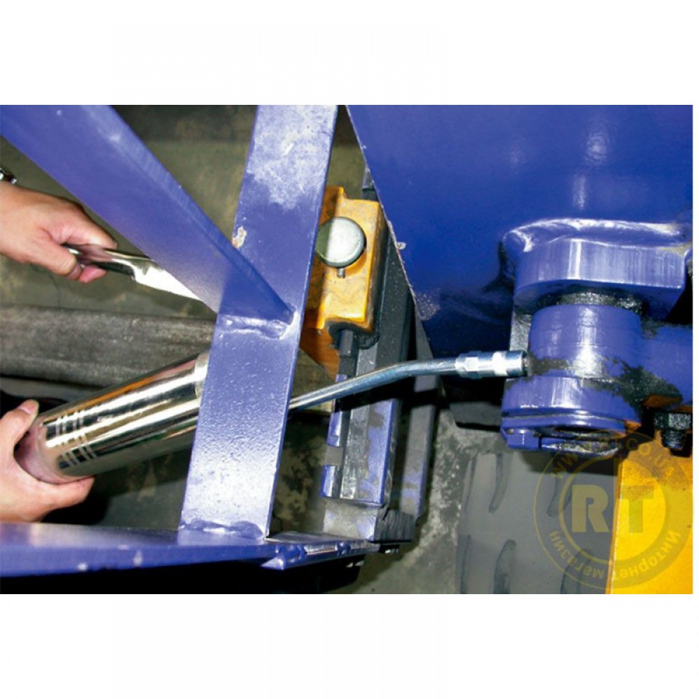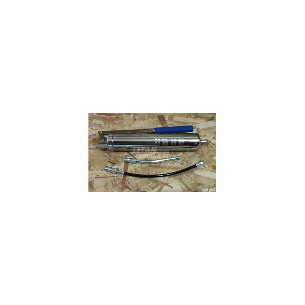 Шприц призначений для нагнітання густого мастила через прес-масляни. Застосовується в автомобільній, сільськогосподарській та інших видах промисловості для змащування вузлів та агрегатів транспортних засобів та техніки. Мастило проводиться за допомогою нагнітання плунжером невеликої кількості мастила. Мастило подається з основної ємності шприца, попередньо заправленим мастилом ручним способом або спеціальним картриджем. Робота проводиться двома руками – тримаючи однією рукою корпус шприца, другою рукою, натискаючи на важіль, нагнітає мастило. Що входить в комплект: Шприц 1 шт Жорстка насадка 1 шт Гнучкий шланг 1 шт Наконечник для прес-масляни 2 шт Технічні характеристики Довжина, мм 360 Об'єм для мастила, мл 400 Номінальний тиск, бар 310 Максимальний тиск, бар 700 Різьблення шлангу (наконечників) 10 мм х 1.0 мм Вага, гр 1240