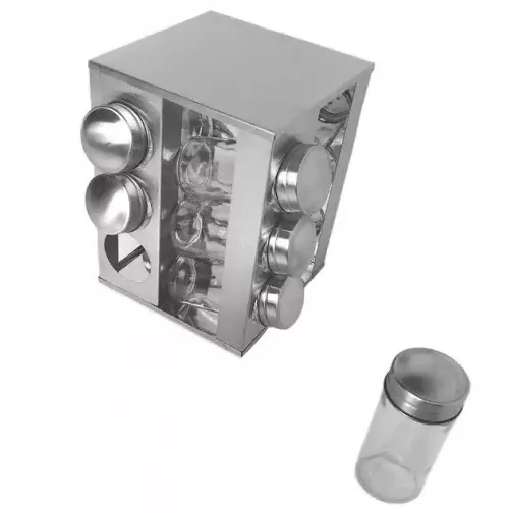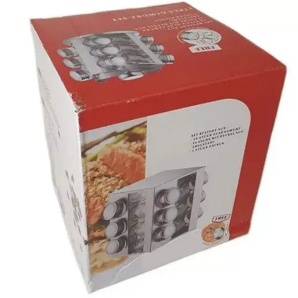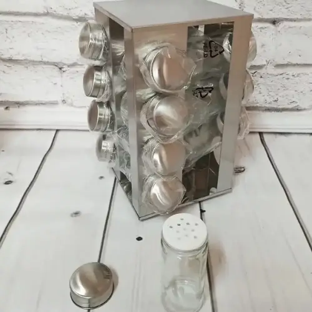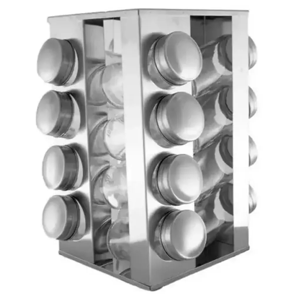 Набор для специй (спецовница) на крутящейся подставке состоит из 17 предметов (подставка квадрат + 16 баночек). Подставка и крышки выполнены из высококачественной нержавеющей стали, банки из ударопрочного стекла. Емкость баночки с отверстиями для высыпания 50 мл. и имеет размеры 43x100 мм. Размеры подставки 170 мм в диаметре и 200 мм по высоте. Данный набор впишется в любой интерьер кухни.