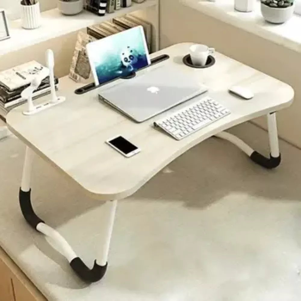 В столе есть складные металлические ножки с прорезиненной противоскользящей основой. Дизайн стола дополнен отверстием для планшета, телефона, ручки, стакана и техники с узким экраном.