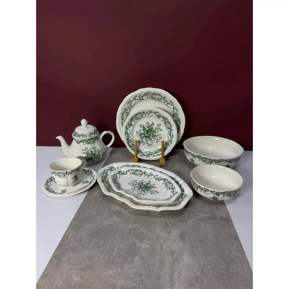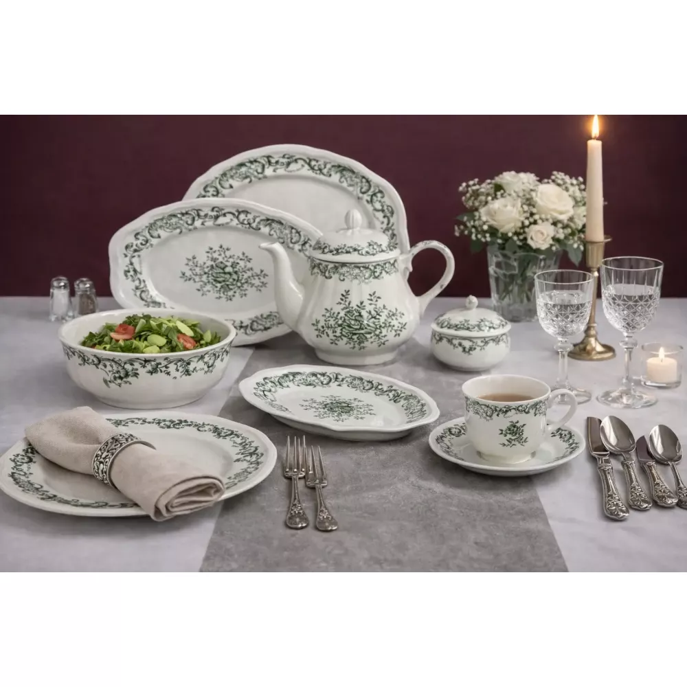 Столовый сервиз DY01 – это утонченное сочетание элегантности, качества и практичности. Нежный белый фарфор с зеленым орнаментом создает ощущение свежести, легкости и безупречного вкуса. Узор напоминает тонкое кружево, придавая сервировке особый шарм и романтическое настроение.