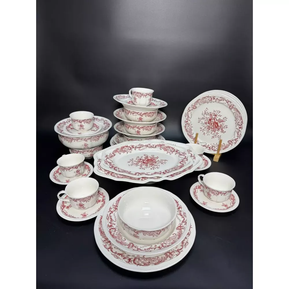 Столовый сервиз RG 1121 – воплощение классической элегантности и изысканного вкуса. Белый фарфор, украшенный изящным бордовым орнаментом в винтажном стиле, создает ощущение аристократической роскоши и гармонии. Каждая деталь продумана до мелочей: плавные формы, благородный рисунок и безупречный блеск фарфора.