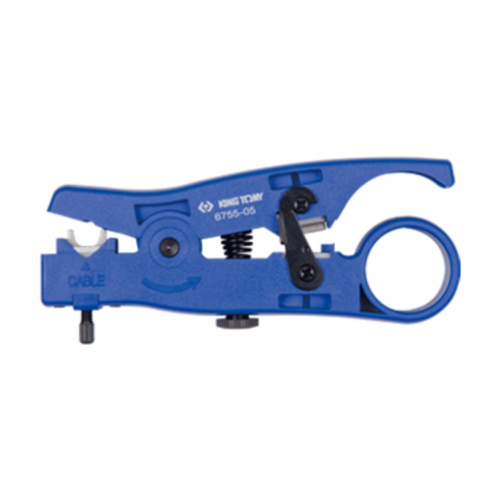 Стріпер для зняття ізоляції та різання багатожильного та плоского кабелю UTP, STP, RJ   Стріпер KING TONY 6755-05 призначений для зняття ізоляції та різання багатожильного та плоского кабелю.     Особливості   • дозволяє працювати з багатожильним проводом діаметром 2,6 - 8 мм;  • можливість різання плоского кабелю діаметром 6 – 12 мм;  • два регулювальні гвинти для точного налаштування;  • стопорний замок.     Технічні характеристики   Матеріал ABS (електростатичний пластик)  Діаметр багатожильного кабелю, мм 2,6 – 8  Діаметр плоского кабелю, мм 6 – 12  Вага, кг 0,072  Країна виробник Тайвань