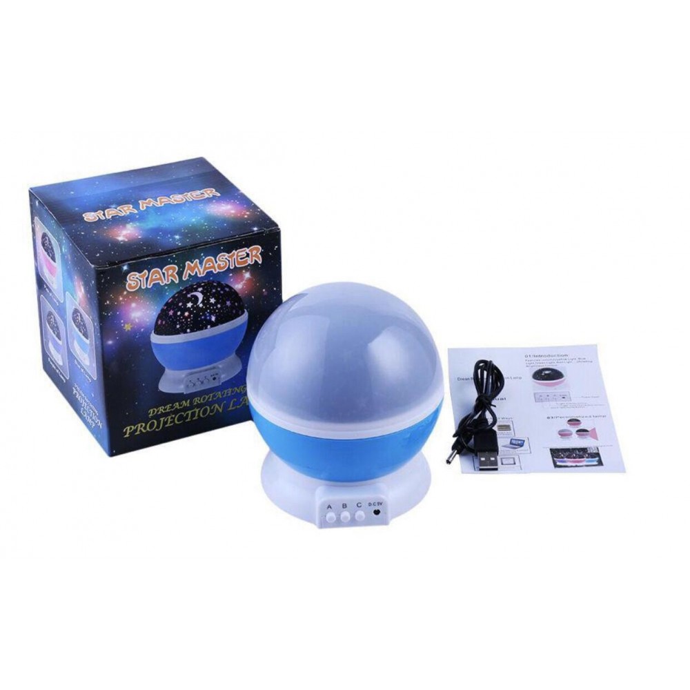 Круглый вращающийся Проектор звездного неба Star Master Dream прекрасный подарок для вашего ребенка. Он осветит комнату вашего малыша прекрасными звездами и луной. Питание светильника возможно от USB-провода или от четырех батареек типа АAA. Комплектуется полупрозрачным матовым колпаком, который позволяет создать более приглушённое уютное свечение. Ночник имеет три кнопки управления, которые соответствуют трём режимам работы (их можно совмещать в любой комбинации). Особенности: довольно яркая проекция белого света (белые звёзды) режим RGB с возможностью выбора одного или переменного свечения красного, синего и зелёного цветов вращение сферы Характеристики: создаёт движущиеся проекции на стене и потолке источник света: 4 светодиодных ламп Режимы работы: 3 кнопки (вращение, белый свет, разноцветное свечение) Напряжение: 5 В Питание: USB-кабель или от батареек АAА 4 шт Материал: пластик