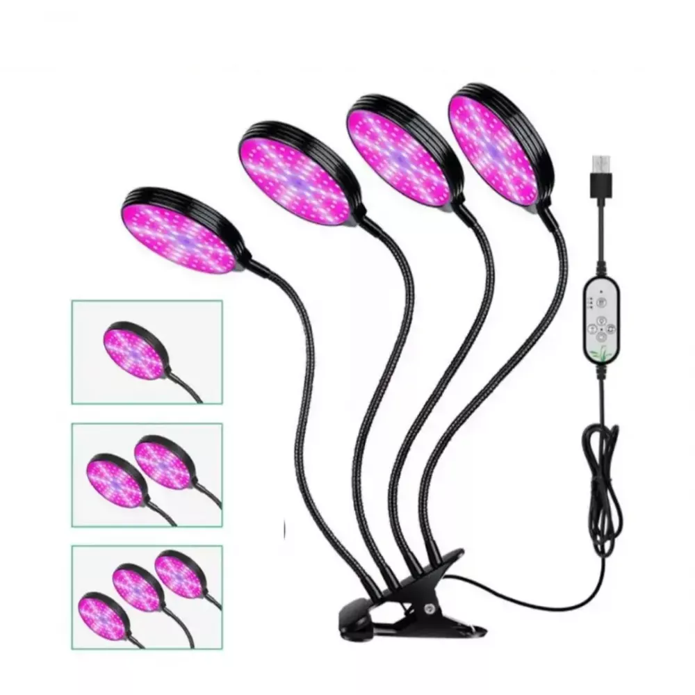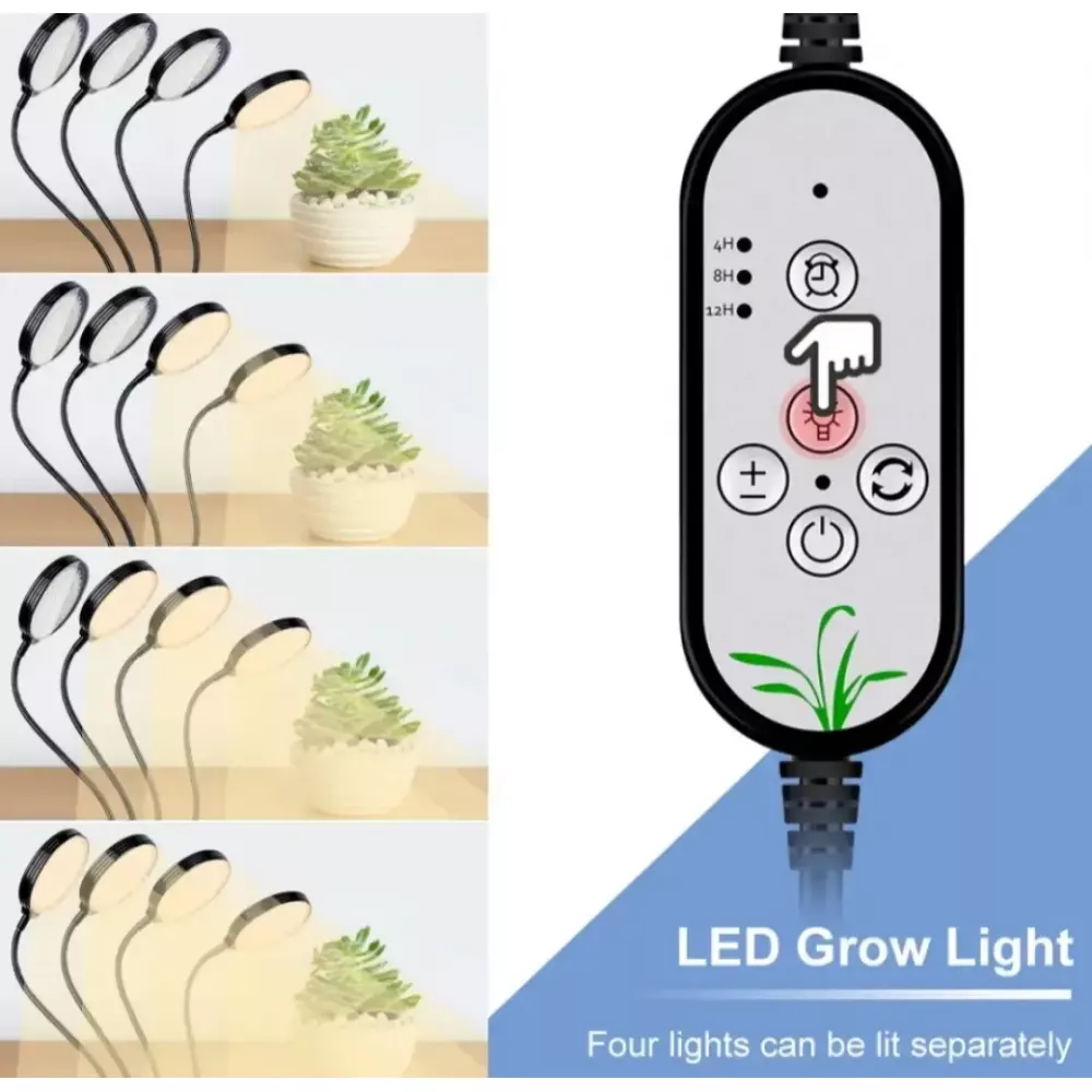 - 5 рівнів яскравості + 3 режими перемикання. Ви можете регулювати яскравість відповідно до різних етапів росту рослин і трьох режимів перемикання освітлення: Велика площа освітлення. Лампа дуже гнучка і має 4 окремі головки, що дозволяє збільшити кут освітлення в кілька разів. Завдяки гнучкості кожної окремої головки лампи, ви можете підібрати та відрегулювати кут освітлення для кожної рослини індивідуально. Така лампа може досягати 360 освітлення.