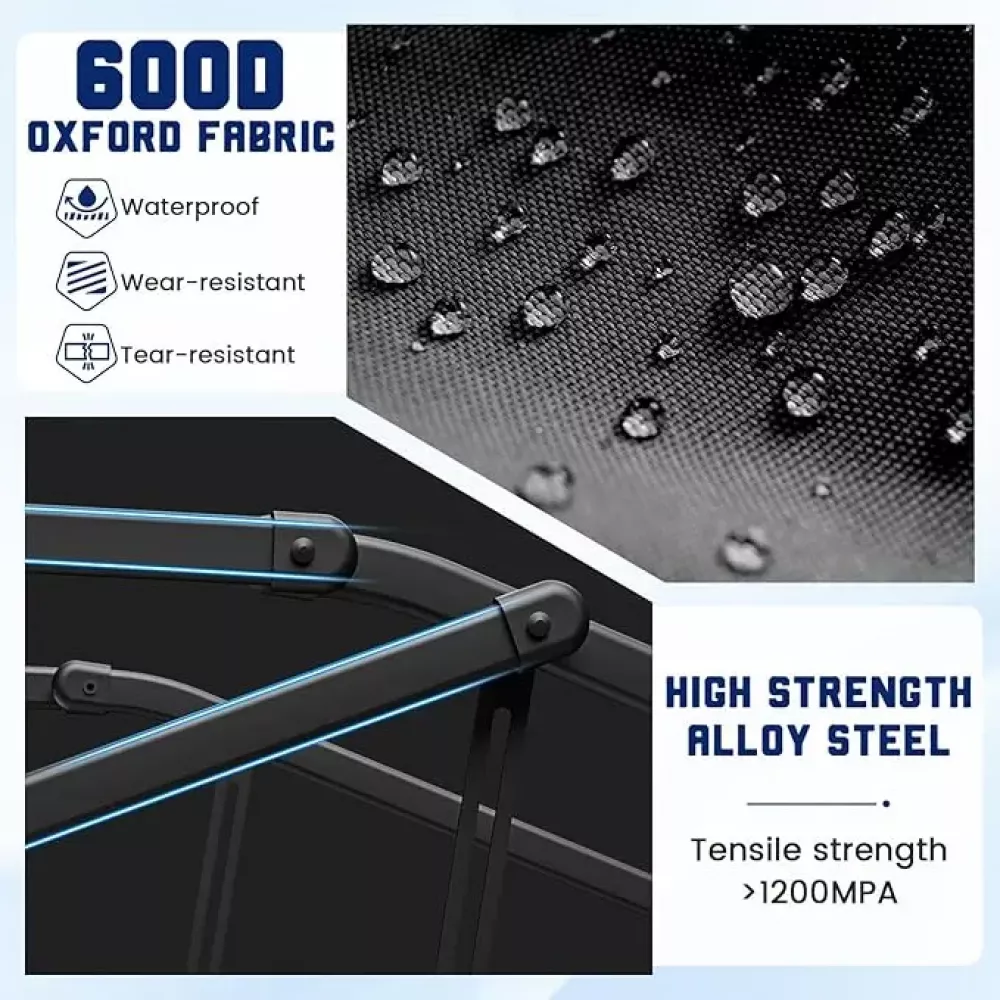Тележка имеет усиленную раму из высокопрочной легированной стали с грузоподъемностью до 180 кг, прочную конструкцию, обеспечивающую долговечность при ежедневном использовании. Двухслойная ткань Oxford 600D обеспечивает превосходную водонепроницаемость и износостойкость, продлевая срок службы изделия.