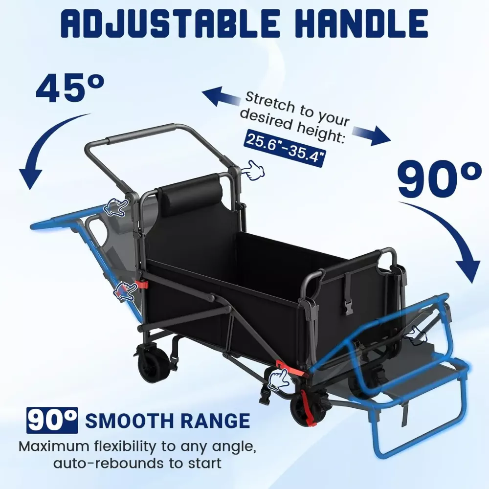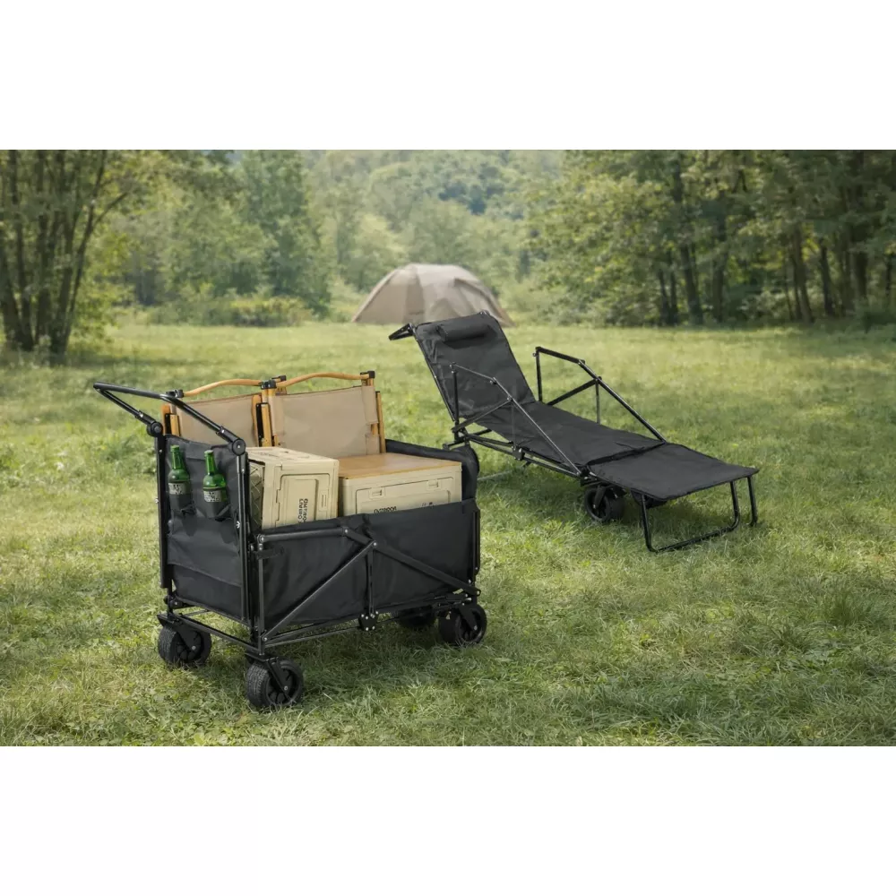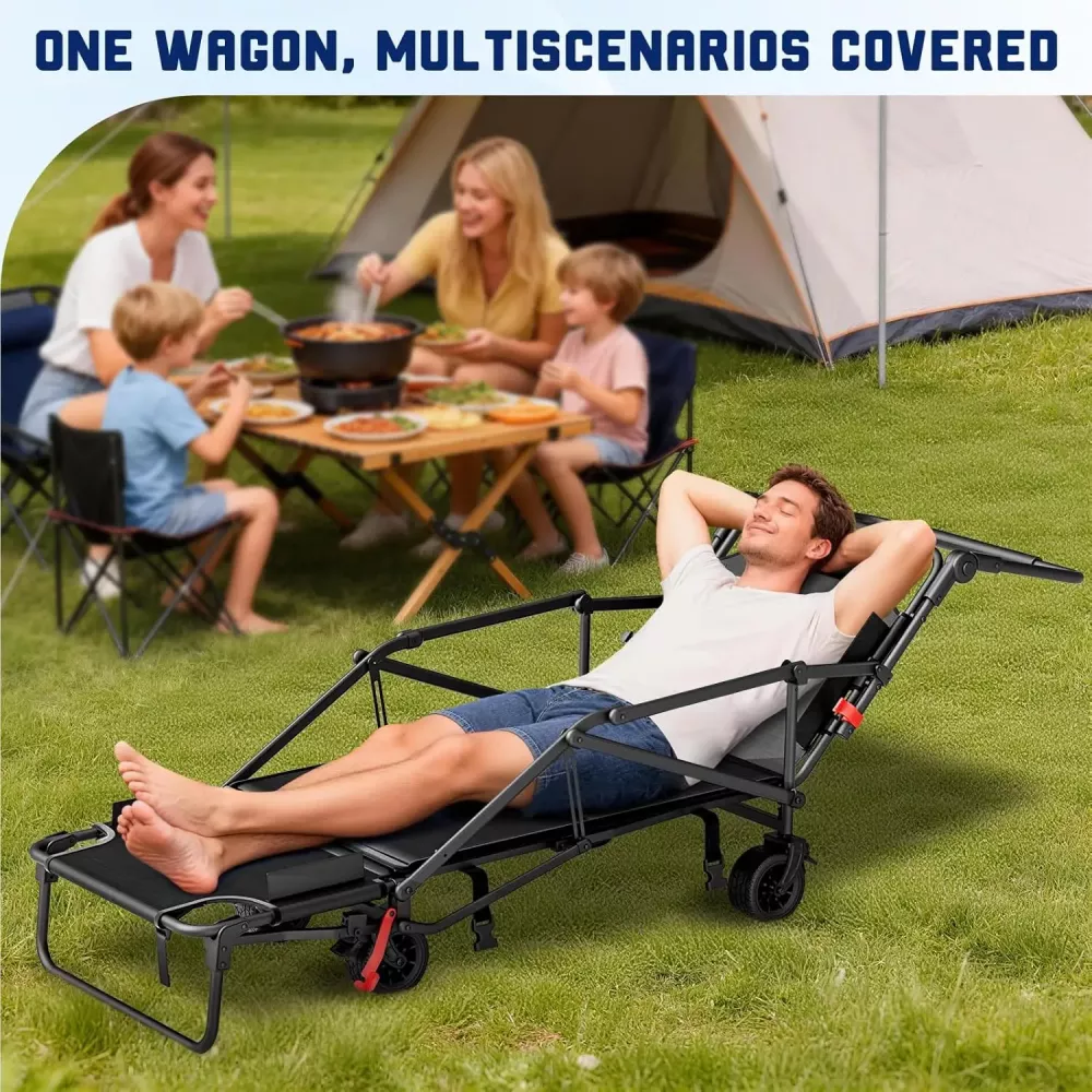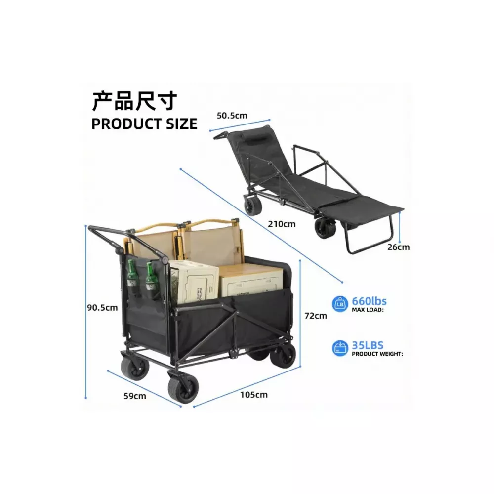 Комбинированная тележка и пляжное кресло. Легко трансформируется из прочной тележки в удобное пляжное кресло за считанные секунды! Идеально подходит для приключений на природе, походов, поездок за продуктами или отдыха у бассейна. Наслаждайтесь удобством двух предметов в одном компактном решении.