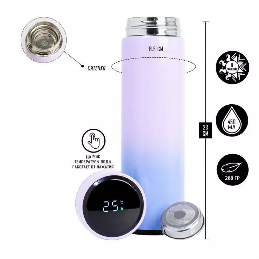 На крышке термос с индикатором температуры имеет встроенный жидкокристаллический экран, на котором отображается температура напитка
