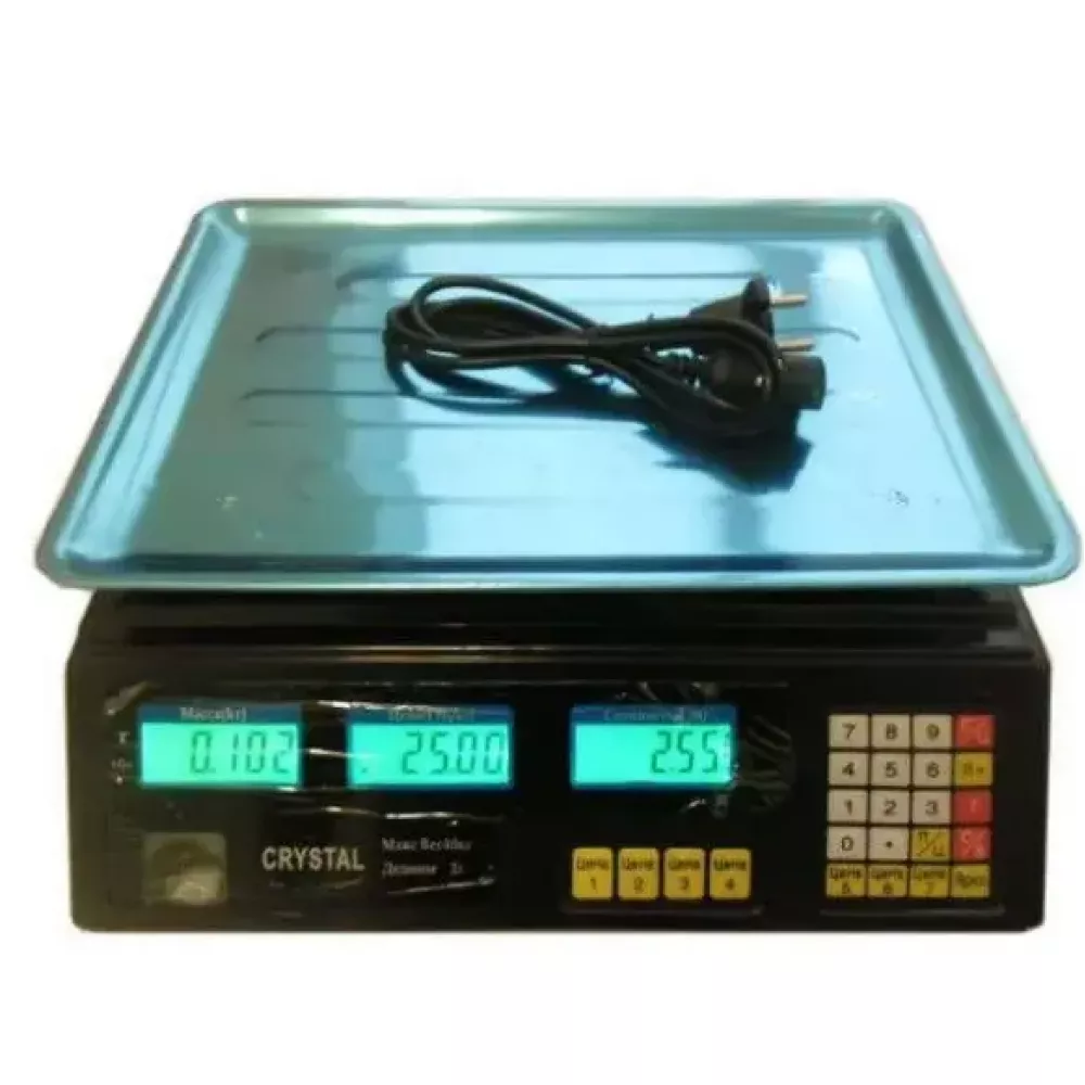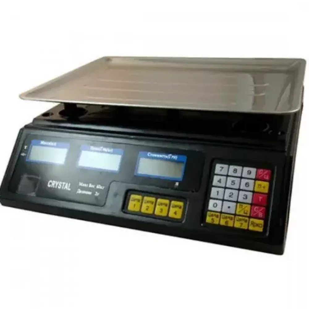 Недорогие торговые весы Crystal с предельно допустимым взвешиванием в 50 кг отлично подойдут как для розничной так и оптовой торговли на рынке или небольшом магазине. Эти электронные весы со счётчиком цены могут работать как от внутреннего аккумулятора 6 В так и от обычной розетки напряжением питания 220 В. Что очень удобно и практично в процессе работы.
