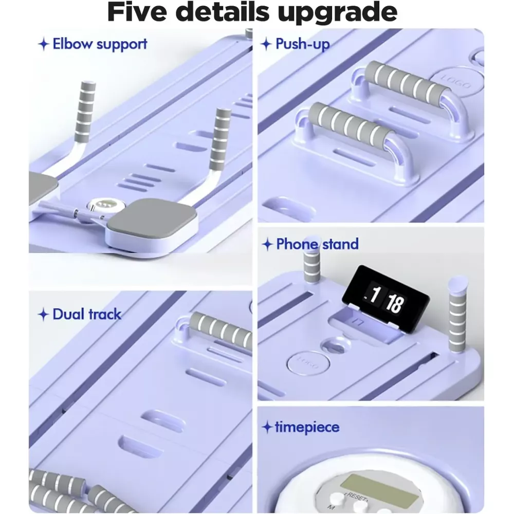 Цей тренажер призначений для зміцнення м'язів кори та реабілітації. Він оснащений регульованими еластичними стрічками опору, вбудованим таймером та м'яким наколінником, підходить для всіх рівнів підготовки та знижує навантаження на суглоби. Ручка для перенесення забезпечує зручне транспортування та зберігання, дозволяючи тренуватися у будь-який час та в будь-якому місці.
