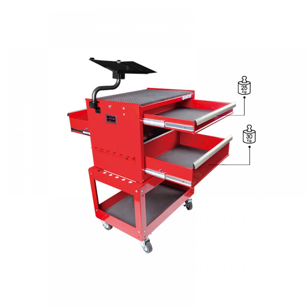 Тумба операторська King Tony (87442-3B) – це різновид інструментальних візків, які можна використовувати для організації робочого місця слюсаря. Тобто, універсальна конструкція здатна зберігати та перевозити ручний інструмент із деталями. А також надавати можливість майстру проводити якісь маніпуляції з вузлами чи деталями, не відходячи від тумби. Операторська тумба King Tony буде корисною фахівцям автосервісу на станції ТО, в гаражі виробничого чи сільськогосподарського підприємства. Така конструкція безцінна у будь-якій сфері, де обслуговується одразу кілька автомобілів. Технічні характеристики операторського інструментального візка 87442-3B: · Фізичні розміри – 765х490х948 (1050 зі знімною панеллю) мм.· Кількість активних секцій – 4 (3 висувні ящики, 1 відкрита ніша).· Максимальне навантаження на конструкцію – 250 кг.· Одна полиця 576х415х75 мм та два ящики 576х415х154 мм можуть витримати до 25 та 30 кг, відповідно.· Колісна база – 4 поворотні коліщатка на підшипниках, з блокуванням ходу. Матеріал виготовлення операторської тумби – високовуглецева сталь. Конструкція зварювальна. Внутрішнє та зовнішнє оздоблення – захисний шар порошкової фарби. У всіх 4-х секціях є полімерні килимки.