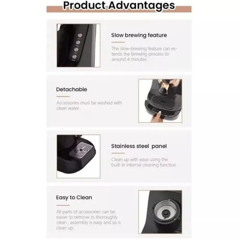 Быстрый нагрев мощностью 700 Вт: эта мощная кофеварка мощностью 700 Вт обеспечивает быстрое приготовление кофе, поэтому вы сможете наслаждаться им уже через несколько минут.