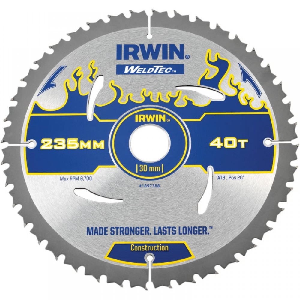 Диск пильний по деревоматеріалам Weldtec CSB 235мм/T40/30/20, IRWIN Зварні твердосплавні зубці на 30 відсотків міцніші, ніж припаяні зубці, що збільшує термін служби на 50 відсотків. Надкомпактний твердий сплав - на 70 відсотків міцніший за стандартний твердий сплав, що забезпечує чудову різкість і якість різання. Повністю загартована пластина працює точніше, продовжує термін служби та довговічність. Інноваційні тепловідведення. Чергування шліфування зуба верхньої фаски (АТВ) для поперечного розрізу і розпилювання дерева всіх порід. У комплекті редуктор-перехідник для отвору на 20мм. Про WeldTec: WeldTec на полотнах циркулярної пилки - це приварювання зубів до полотна на відміну від традиційного паяння зубів. Ідеально підходить для ручних та акумуляторних лез, оскільки зварний шов забезпечує міцне з'єднання у разі несподіваних ударів цвяхами або попадання сторонніх предметів у дерево.