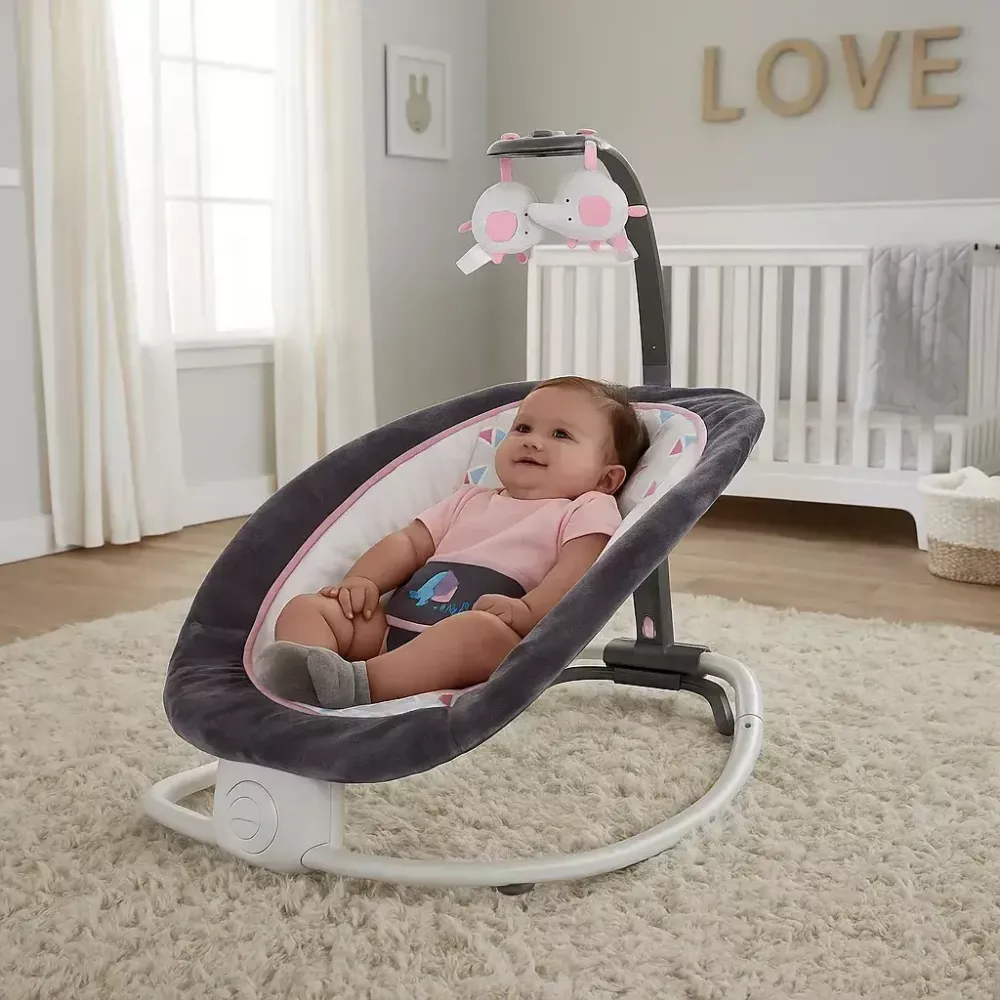 Завдяки функції похитування малюк швидко заспокоїться і засне, а яскраві підвісні іграшки розважать його в період неспання. Регульований нахил спинки дозволяє вибрати оптимальне положення для годування чи відпочинку. Легко складається для зберігання та транспортування, що робить його ідеальним для подорожей та поїздок до бабусі.