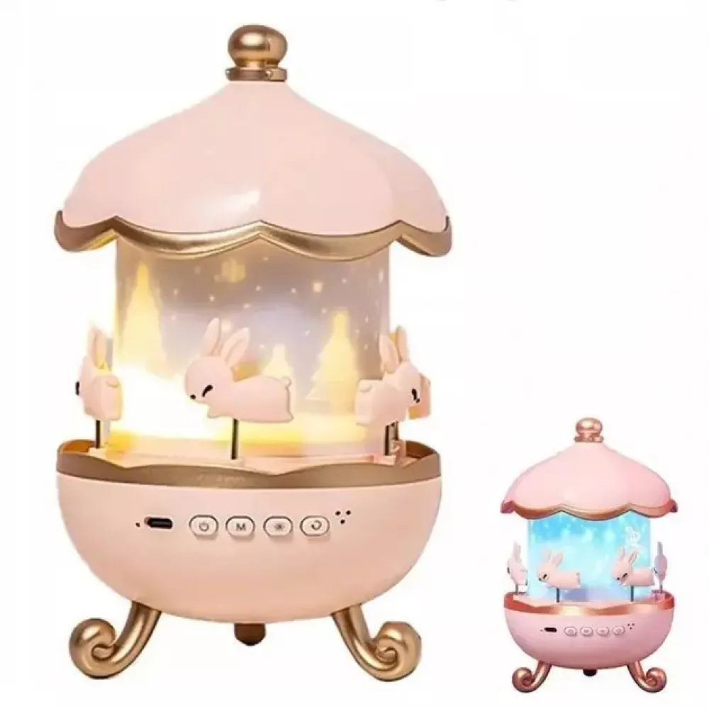 Нічник-проектор Fairy Tale E11 - дивовижна казка прямо вдома. Чудеса починаються як тільки ви відкриваєте коробку. Миліший нічник відразу піднімає настрій своїм стильним дизайном, він виконаний у формі каруселі по колу якої обертаються милі рожеві зайченята (при необхідності їх можна зафіксувати). Bluetooth дозволяє перетворити нічник на колонку і послухати казку на ніч або увімкнути святкову мелодію.