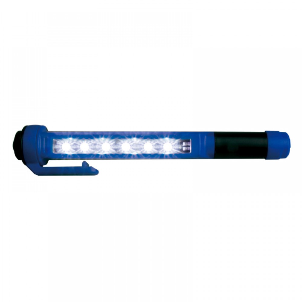 Ліхтарик виготовлений у вигляді ручки, кріплення – кліпса+магніт. Шість світлодіодних елементів вмонтовані вздовж корпусу ліхтарика. Кліпса-магніт може повертатися щодо корпусу ліхтарика на 360 градусів, таким чином, закріпивши ліхтарик у себе на одязі, або встановивши за допомогою магніту на металевій поверхні, ви можете направити світловий потік ліхтарика в потрібну сторону. Корпус ліхтарика виготовлений з міцного АБС-пластику, що надає йому такі характеристики як стійкість до ударів, вологостійкість, масло- і бензостійкість, кислотостійкість. Характеристики Яскравість: 135 люмен (lm) Розміри: 165 x 25 x 30 мм Вага: 58 гр Живлення: AAAx 3