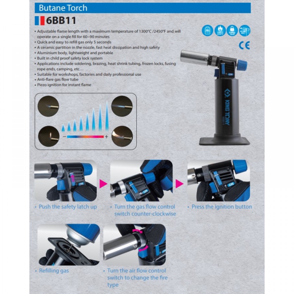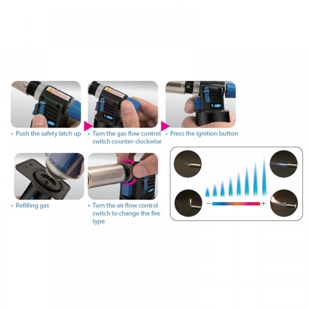 -Регульована тривалість пламені з максимальною температурою 1300°C/2450°F, година роботи на одному заправленні від 60 до 90 хвилин. -Швидка та проста заправка газом лише за 5 секунд. -Керамічна перегородка у форсунці, швидке відведення тепла та висока безпека. -Алюмінієвий корпус, легкий та портативний. -Вбудована система захисту від дітей. -Область застосування: паяння, термозбіжну трубку, заморожені замки, сплавлення кінців веревки, кемпінг тощо. -Підходити для майстерень, заводів та щоденного професійного використання. -Протифакельна газова трубка. -П'єзорозпав для миттєвого пламені.