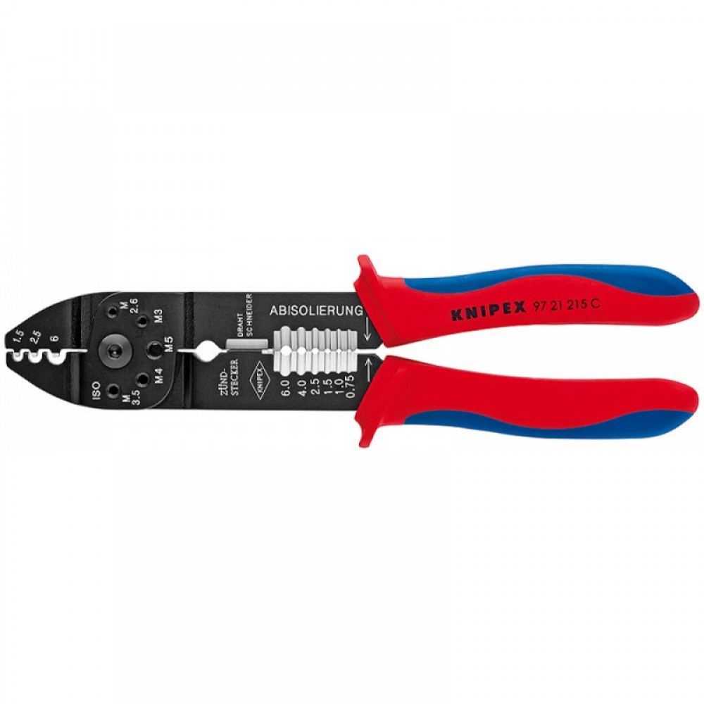Кліщі затискні для обпресування KNIPEX 97 21 215 C AWG 20 - 10 Кліщі воронені Кількість гнізд 3 Застосування кабельні наконечники без ізолятора + кабельні з'єднувачі Ручки двокомпонентні Довжина загальна 230 mm Вага нетто 222 g для різання кабелів, видалення ізоляції з проводів та опресування ізольованих та неізольованих кабельних наконечників та штекерів з різальними вибірками для різання мідних або латунних різьбових шпильок M 2,6; M 3; M 3,5; M 4 та M 5 гвинтовий шарнір для високої стабільності та рівномірності ходу спеціальна сталь, високоміцна