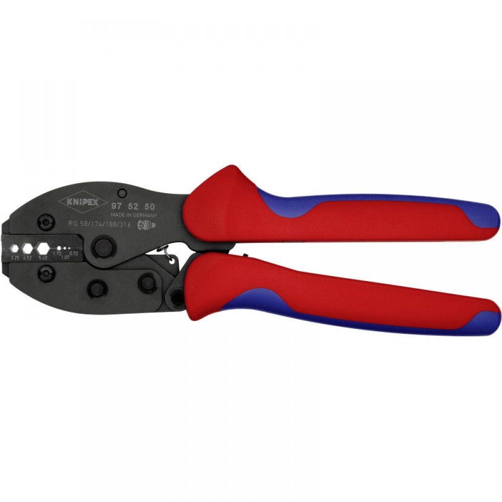 Кліщі для опресовування KNIPEX PreciForce 97 52 50 Незмінно висока якість опресування за профілями високої точності завдяки примусовому блокуванню з фіксацією Тиск опресування прецизійно встановлений виробником, регулюється Висока передача зусилля завдяки високому передавальному відношенню важелів Зручність роботи, завдяки гарному розташуванню ручок, незначній вазі, укороченій конструкції Хромованадієва електросталь особливої якості, загартована в маслі Штекер КОАХ, BNC для RG 58, 174, 188, 316 Воронені Двокомпонентні чохли Довжина 220 мм Вага 493 г
