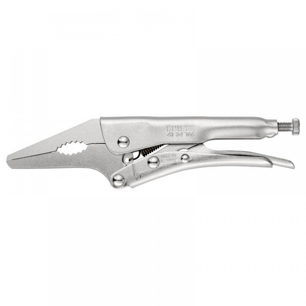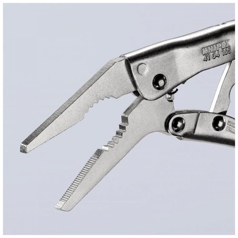 41 34 165 Кліщі затискні надійно фіксують круглі, профільовані та плоскі деталі. Для високого навантаження. З настроювальним гвинтом та важелем розблокування. Для роботи однією рукою. Висока зусилля затиску завдяки важелевому механізму. Кліщі затискні подовжені, тонкі, довгі губи. - Форма: 3 - Діапазон затиску: круглі деталі: 20mm - Діапазон затиску квадрат: 10mm - Діапазон затиску шестигранник: 24mm Комплект поставки: 1 x KNIPEX