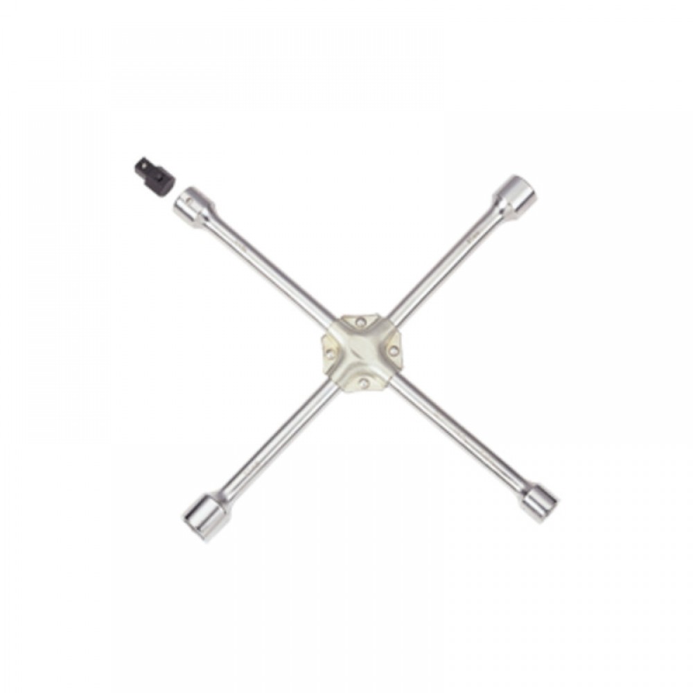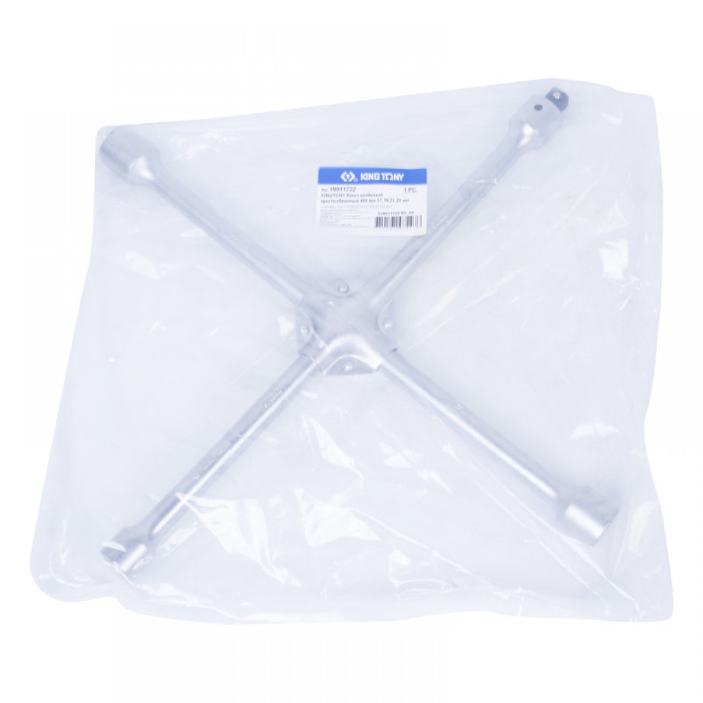 Ключ хрестоподібний (балонний) – гайковий ключ торцевого типу для відкручування або затягування гайок та болтів при роботі з автомобільними колесами. Виробник: King Tony Країна виробник: Тайвань Тип ключа: хрестоподібний Посадка: шестигранна метрична (17, 19, 21, 22 мм) Конструкція: зварена, нерозбірна Матеріал: хромованадієва сталь Оздоблення: хромування, полірування Розмір: 400 х 400 мм Вага: 1700 грам Комплектація: ключ хрестоподібний та вставка-перехідник під головку формату 1/2" (довжина 34 мм). Грані голівки тонкі – хрестоподібний ключ підходить для обслуговування коліс із литими дисками з легких сплавів. Посилений корпус інструменту сумісний із ударним гайковертом.