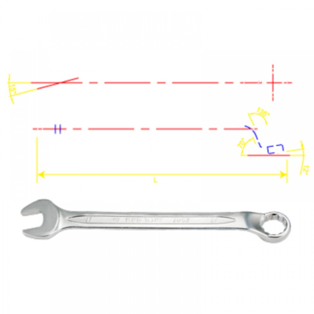Ключ ріжково-накидний з вигином 45° 11mm – комбінований гайковий інструмент для монтажу та демонтажу різьбових з'єднань будь-якої складності. Ручний інструмент затребуваний в автосервісі та на виробництві, у побуті та будівництві. Рожково-накидний ключ зручний для роботи з кріпленням у важкодоступних місцях вузлів та механізмів. Перевага інструменту у зручній конструкції. Накидна 12-гранна головка розташована під кутом 135 градусів щодо корпусу та 45 градусів до осі різьбового з'єднання. Рожкова шестигранна частина ключа має кут 15 градусів. Виробник: King Tony Країна виробник: Тайвань Тип інструменту: ключ гайковий, комбінований Робочий розмір: 11 мм, двосторонній Матеріал: легована сталь (хром, ванадій) Оздоблення: хромування Розмір: довжина 160 мм Вага: 59 грам Кількість ключів в упаковці – 20, у ящику – 320 штук.