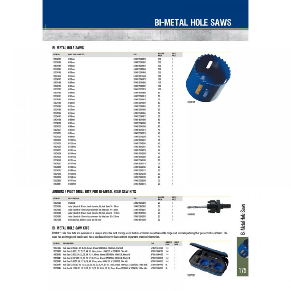 Коронка по металу IRWIN біметалічна 32 мм 1-1/4" Біметалічна кільцева пила для свердління алюмінію, міді, заліза, нержавіючої сталі, цинку, дерева та гіпсу. Коронки IRWIN виробляються за запатентованою технологією WeldTec, це приварені електронно-променевим зварюванням прецизійні зубці зі змінним TPI з HSS сталі. Змінюваний крок і глибина зубів забезпечує більш швидке різання при меншому зусиллі та підвищену продуктивність у різних матеріалах, а також відмінне відведення стружки. Дно коронки має товсту армуючу пластину для більшої жорсткості, що дозволяє використовувати коронку у складних умовах роботи. Стінки коронки мають отвори для тепловідведення та зручного вилучення залишків стружки. Виріб упакований у картонну коробку. На упаковці розміщена інформація про робочі обороти в різних матеріалах та додаткові аксесуари для коронки.