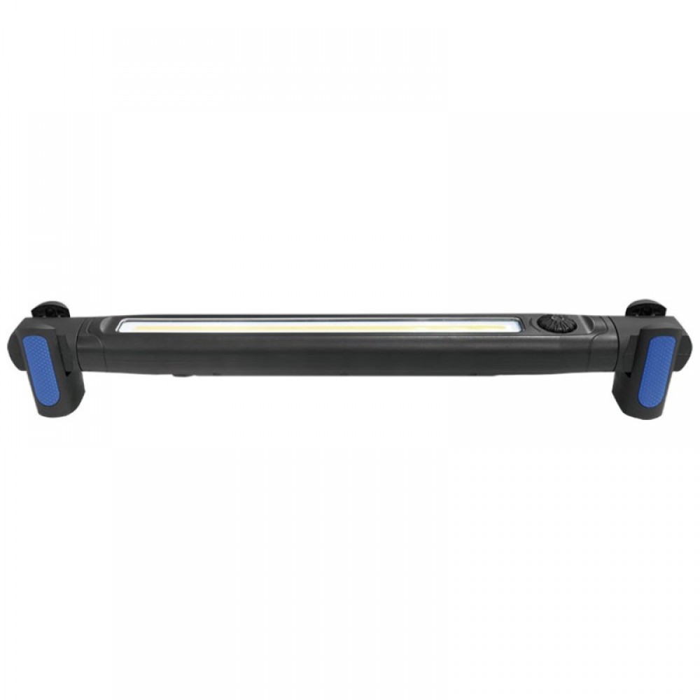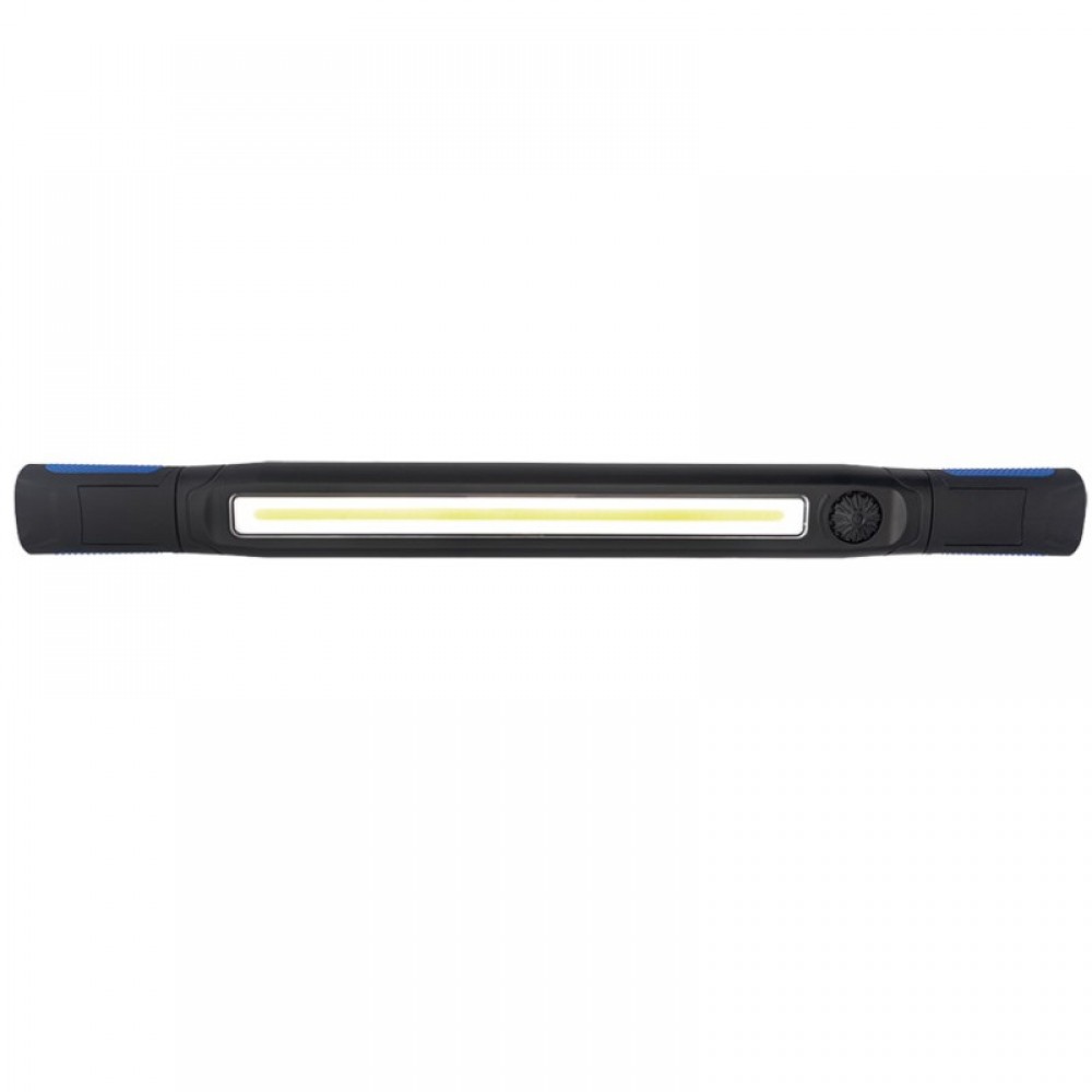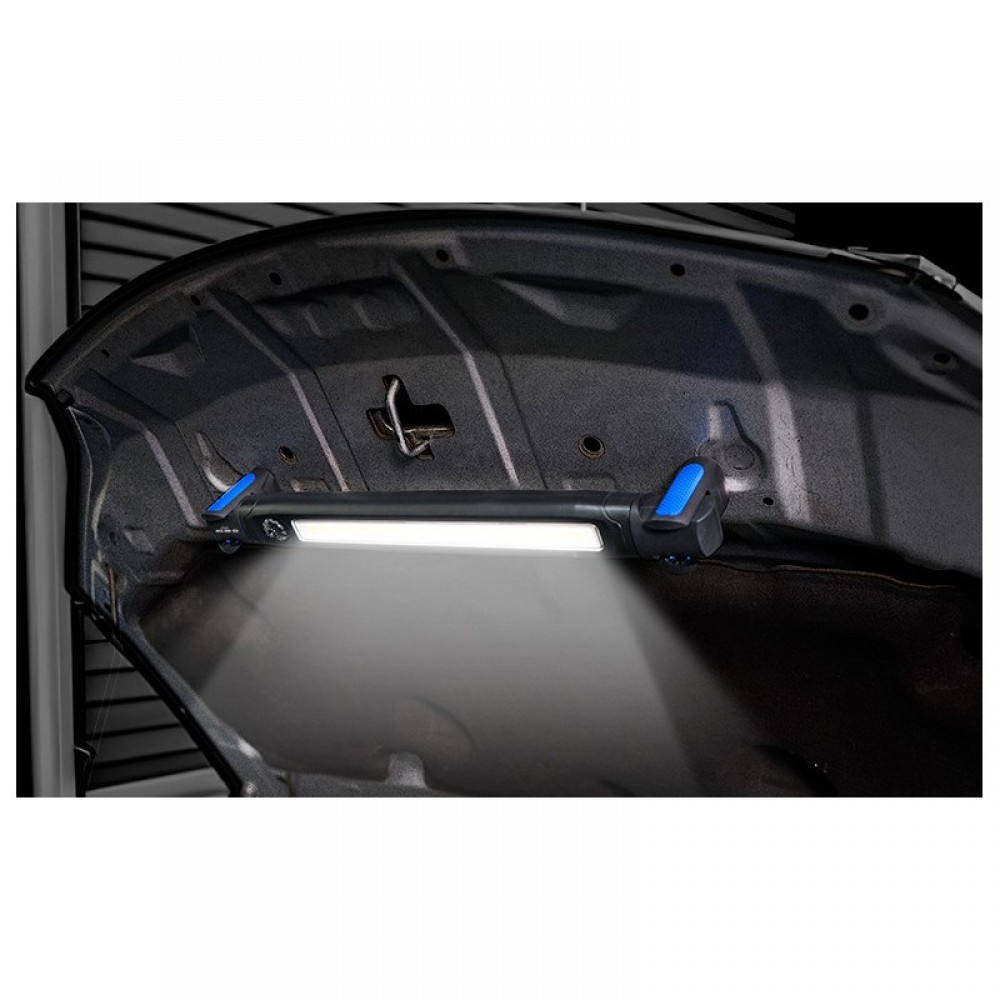 Підсвічування деталей механізмів, вузлів агрегатів та інших пристроїв та місць, де потрібне додаткове освітлення під час проведення діагностичних чи ремонтних робіт. Галузь застосування: Станції технічного обслуговування автомобілів (СТО), автосервіси, автомайстерні, побутове використання. особливості: • Світловий елемент COB LED – матричне нанесення світлових кристалів на пластину (COB – Chip-on-Board) • Магнітний шарнір: ліхтар можна встановити під будь-яким кутом на будь-яку металеву поверхню • Водонепроникний корпус Технічні характеристики: Основне світло 10 Вт COB LED 6500K, 1200/400 люмен (lm) Регулювання яскравості двоступенева Світлодіодний індикатор заряджання є Магнітний шарнір, 2 шт. Акумулятор Li-Ion: 7,4 В/2600 мAг Зарядний пристрій AC 100-240 В, 50/60 Гц Час заряджання 4,5 год Час роботи 2,2/5,5 год Клас водонепроникності IP 54 Клас захисту від механічних дій IK07 Матеріал корпусу: ABS-пластик, гумові вставки Габарити: 500 x 60 x 60 мм Вага: 0,487 кг Корпус виготовлений відповідно до директиви CE RoHS (регламент з обмеження вмісту шкідливих речовин)