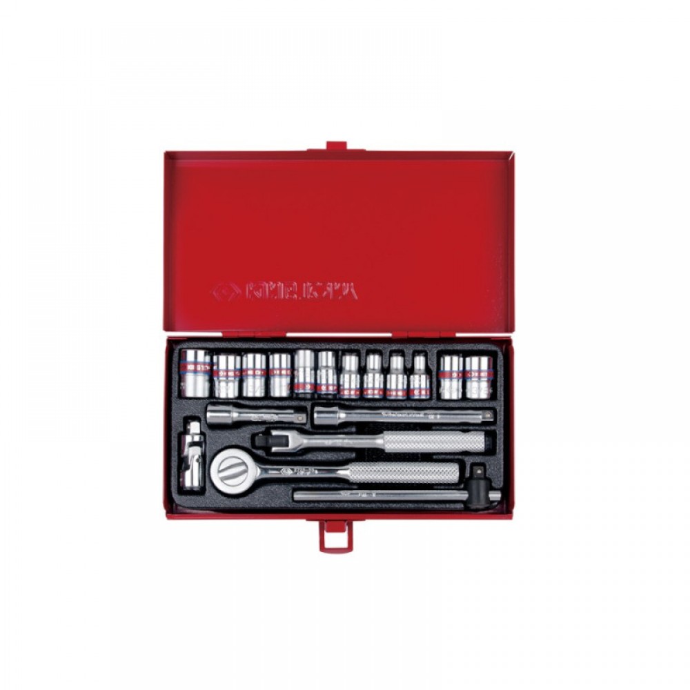 Набір торцевих головок дюймових та ключів KING TONY 1/4"DR 5/32"-1/2", 18 предметів (2518SR) особливості: Застосовуються для закручування та відкручування гайок та болтів із шестигранною та восьмигранною головкою Головки виготовлені з хромованадієвої сталі Покриті хромом, який захищає інструменти від корозії. Висока якість матеріалів Тривалий термін служби Комплектація: Торцеві головки 5/32", 3/16", 7/32", 1/4", 9/32", 5/16", 11/32", 3/8", 7/16", 1/2 " Торцеві головки восьмигранні 5/16", 3/8" Подовжувачі 55, 100 мм Т-подібний комір 115 мм Вороток із шарніром 130 мм Тріскачка, 45 зубців, 140 мм Кардан Постачається в металевому кейсі